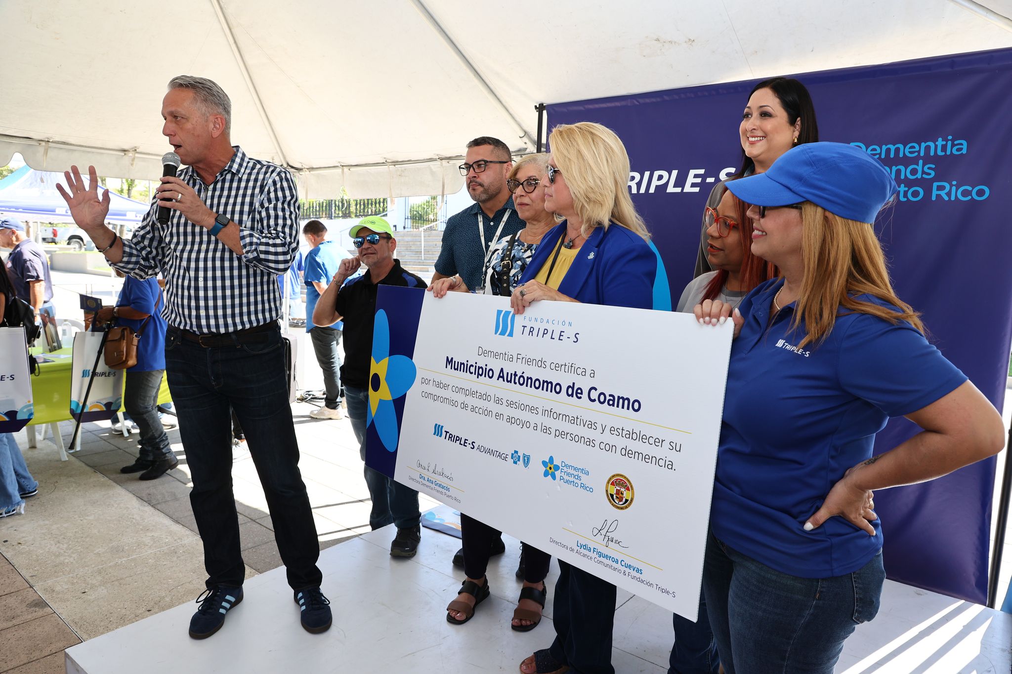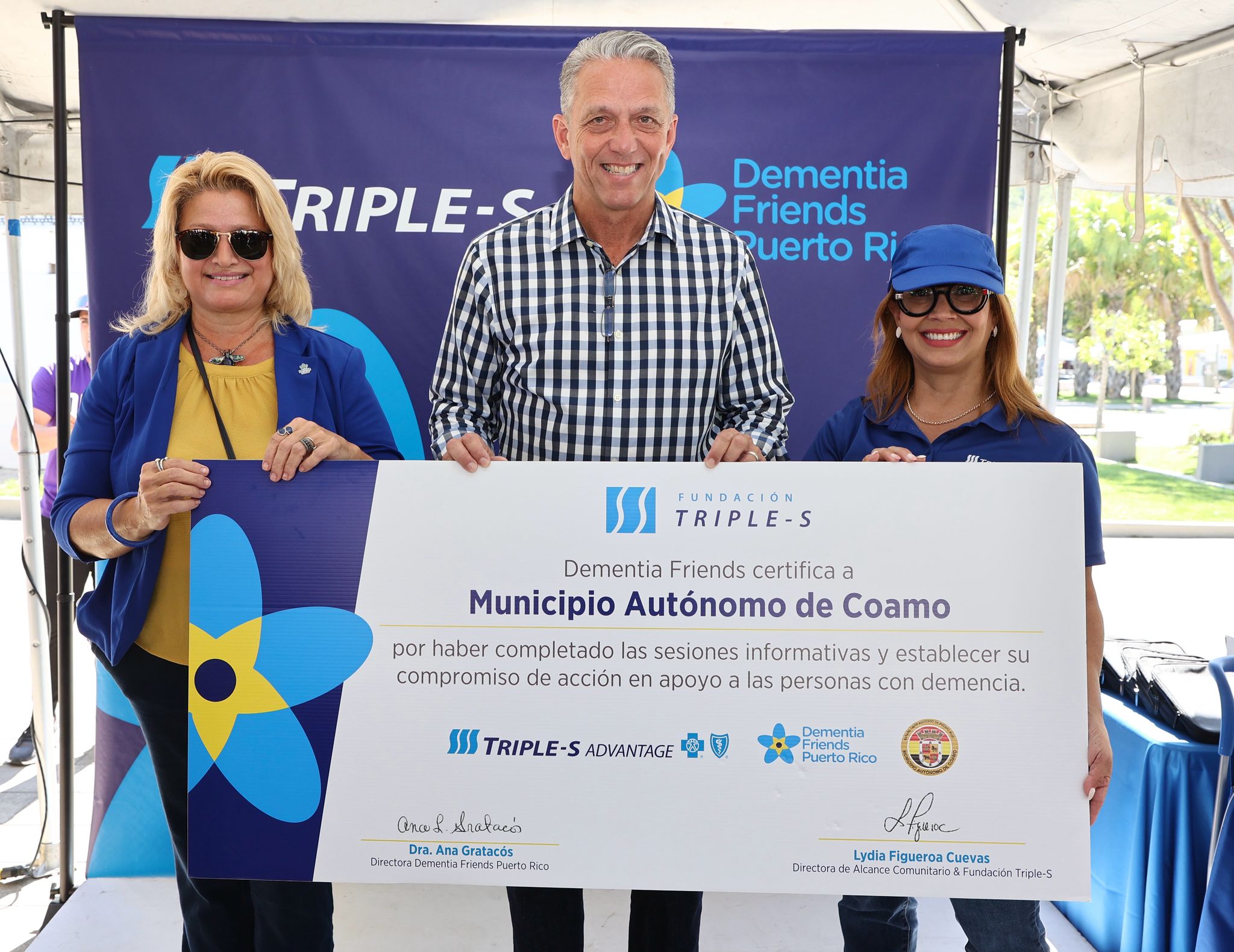 Durante el evento con más de 200 participantes, Ana GratacósRodríguez, presidenta de Dementia Friends Puerto Rico y Lydia Figueroa Cuevas, directora ejecutiva de la Fundación Triple-S, entregaron al alcalde Juan Carlos García Padilla, el certificado que le convierte en el quinto municipio de Puerto Rico en recibir esta distinción. Desde el 2021 la Fundación Triple-S y Dementia Friends Puerto Rico, han trabajado talleres gratuitos como parte de sus iniciativas educativas globales con el propósito de sensibilizar y educar sobre la demencia.