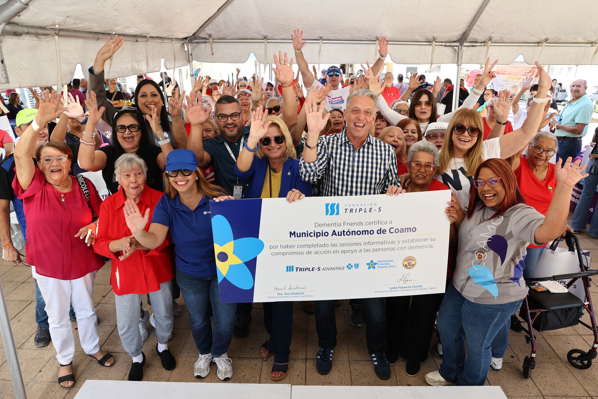 Tras cumplir con todos los requerimientos de capacitación sobre la población con demencia, la Fundación Triple S certificó hoy como Dementia Friends al Municipio de Coamo durante el Dementia Friends Tour en el que organizaron actividades educativas, interactivas y de entretenimiento dirigidas a adultos mayores, cuidadores y público general en la Plaza Pública Luis Muñoz Rivera.