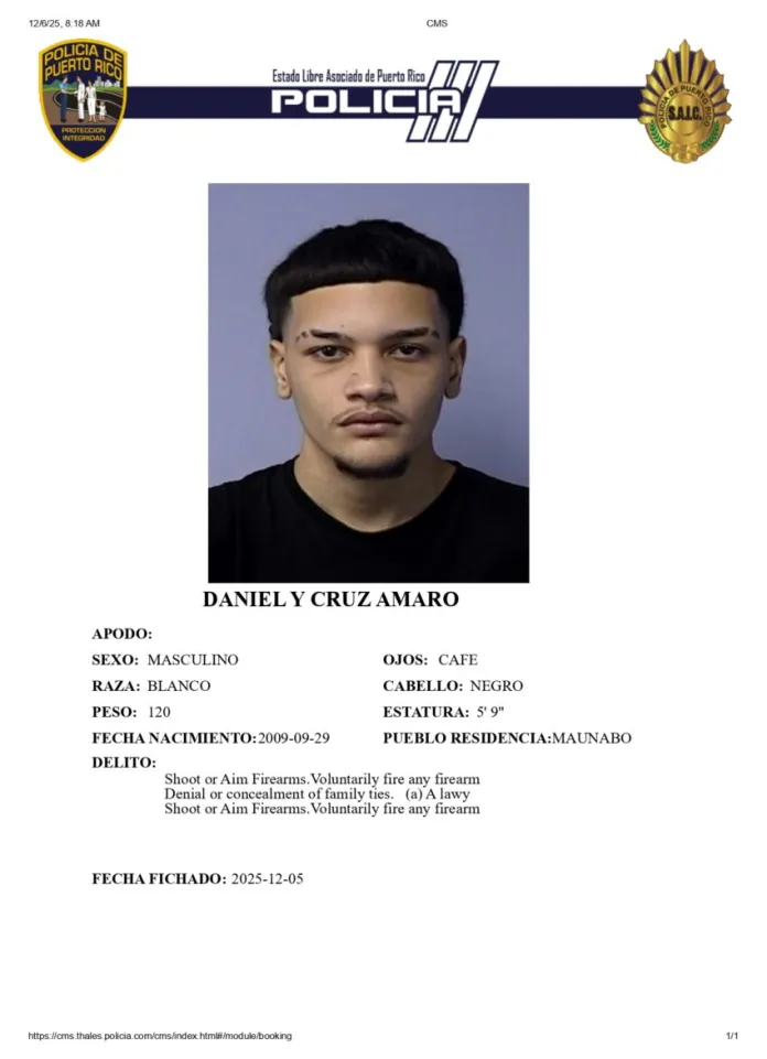 El imputado, identificado como Daniel Y. Cruz Amaro, enfrenta también cargos por tentativa de asesinato y violaciones a los artículos 6.05 (Portación, Transportación o Uso de Armas de Fuego) y dos cargos por disparar o apuntar armas de fuego de la Ley 168 de Armas de Puerto Rico, detalló la Policía en un comunicado.