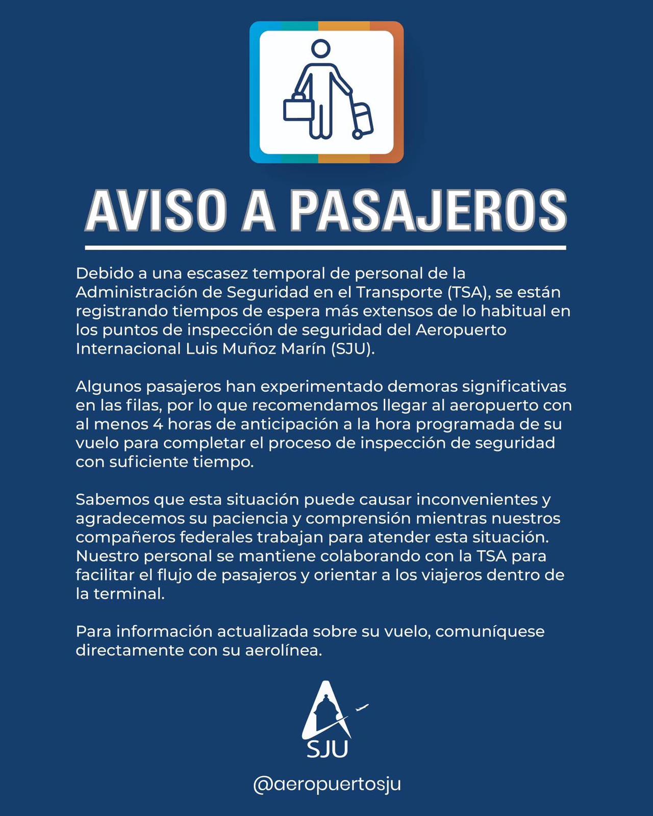 La administración del Aeropuerto Internacional Luis Muñoz Marín informó a los pasajeros que actualmente se están registrando tiempos de espera más largos de lo habitual en los puntos de inspección de seguridad debido a una escasez temporal de personal de la Administración de Seguridad en el Transporte (TSA, por sus siglas en inglés).