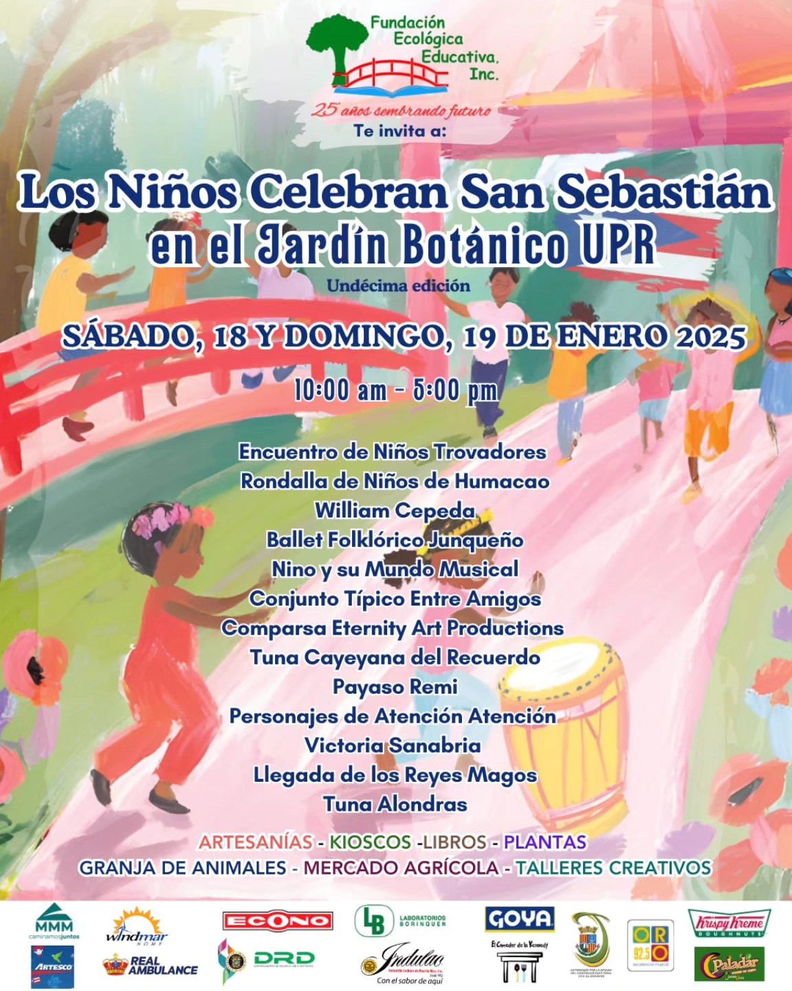 Nuevamente los niños celebran las Fiestas de la Calle San Sebastián en el evento más esperado de la familia puertorriqueña “Los Niños celebran San Sebastián en el Jardín Botánico UPR”. Durante los días sábado, 18 y domingo, 19 de enero de 2025 se estará ofreciendo un variado programa de talleres, espectáculos musicales y otras actividades dirigidas a todas las edades. En la actividad habrá kioscos, artesanos y sano entretenimiento en el ambiente natural del Jardín Botánico. El evento es libre de costo para los niños; a los adultos se les solicita un donativo de $2.00 (dos dólares) en la entrada. También habrá espacio para hacer horas comunitarias, horas de contacto verde y para artesanos. ¡Los esperan ambos días desde las 10:00 de la mañana!