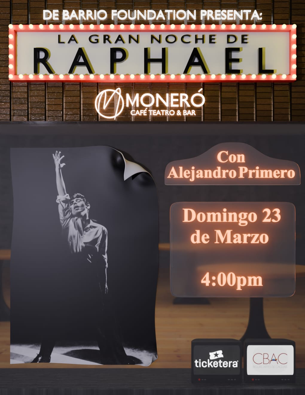 El próximo domingo 23 de marzo a las 4:00 p.m., el Moneró Café Teatro y Bar, ubicado en Bellas Artes de Caguas, será el escenario de “La Gran Noche de Raphael”, un espectáculo en homenaje al inmortal artista español.