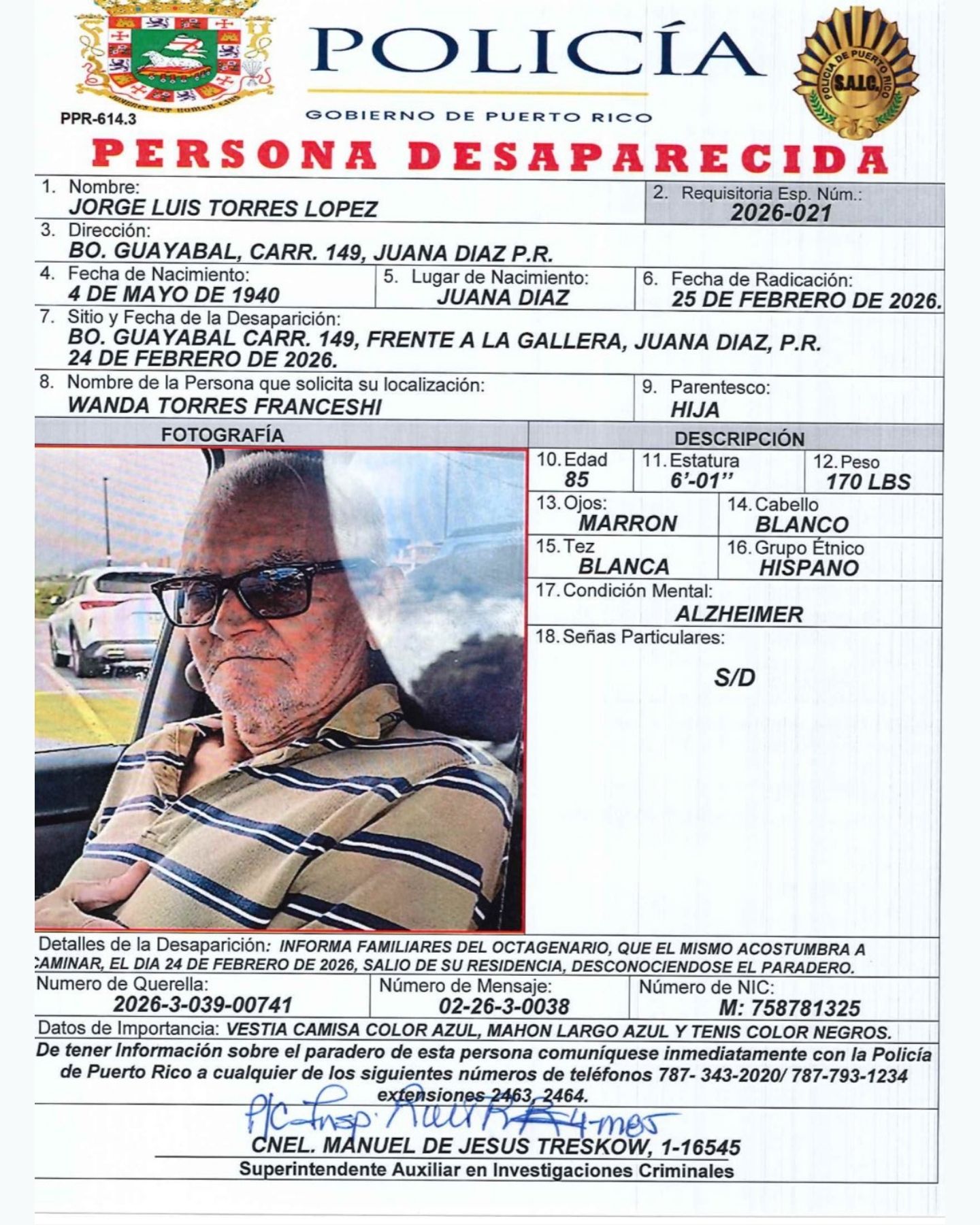 Jorge Luis Torres López, de 85 años, fue reportado como desaparecido hoy por su hija, Wanda Torres Franceschi, tras este salir de su residencia en la carretera 149 kilómetro 63.2 frente a gallera del barrio Guayabal, en Juana Díaz. Tiene padecimiento de Alzheimer.