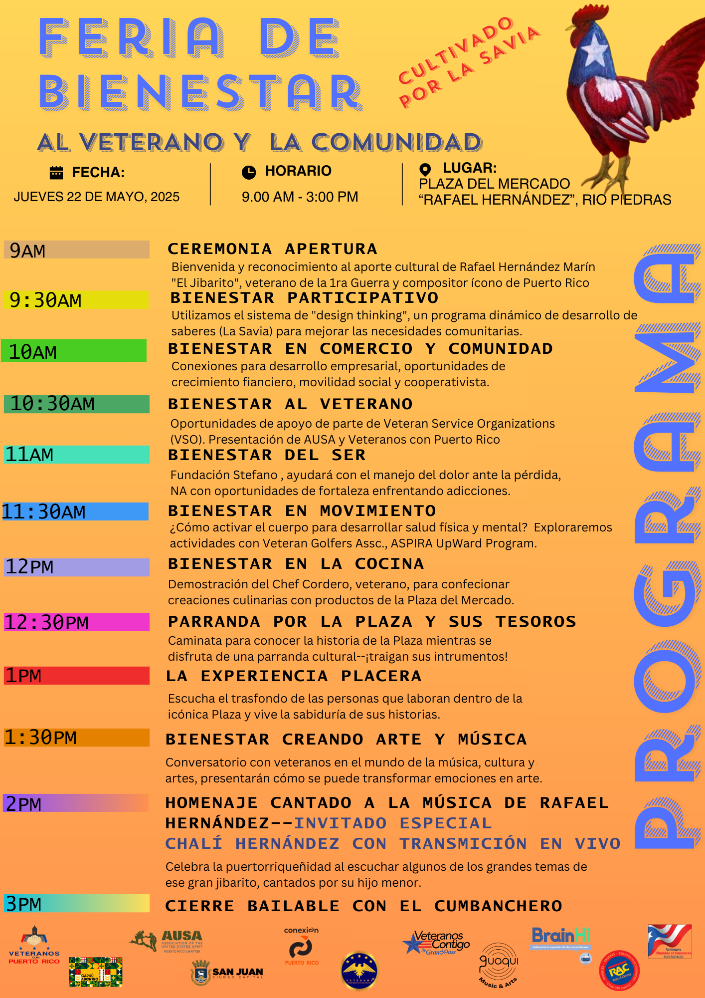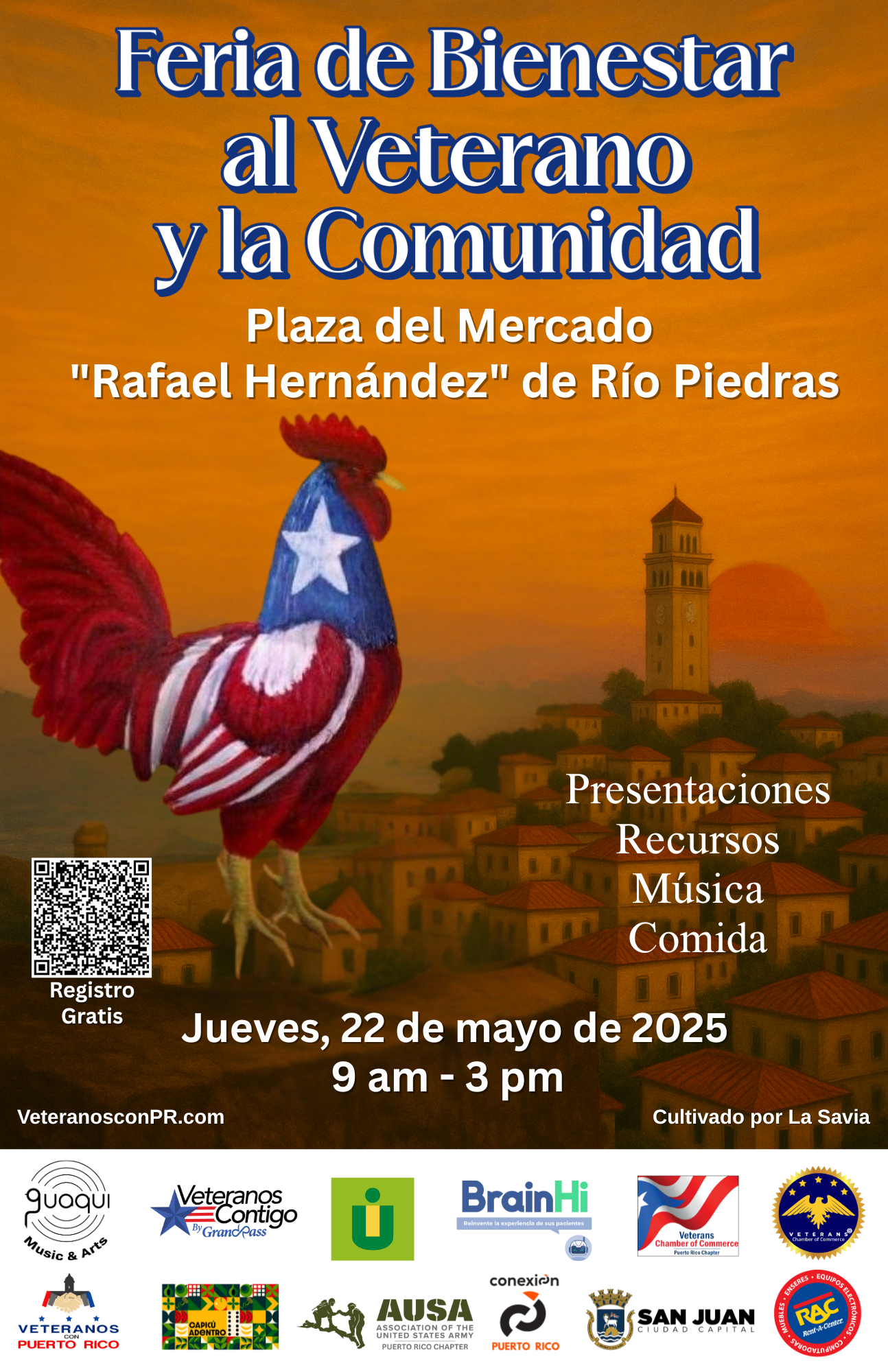 El comité organizador compuesto por Veteranos con Puerto Rico, la organización comunitaria A Place For You y La Savia (organización dedicada a promover los espacios de saberes alternativos), junto a la Association of the United States Army (AUSA) – Capítulo de Puerto Rico, invitan a la comunidad veterana y al público en general a participar de la Feria de Bienestar al Veterano y la Comunidad, que se celebrará el jueves, 22 de mayo de 2025, de 9:00 a.m. a 3:00 p.m., en la Plaza del Mercado de Río Piedras “Rafael Hernández” (Veterano de la 1ra Guerra).