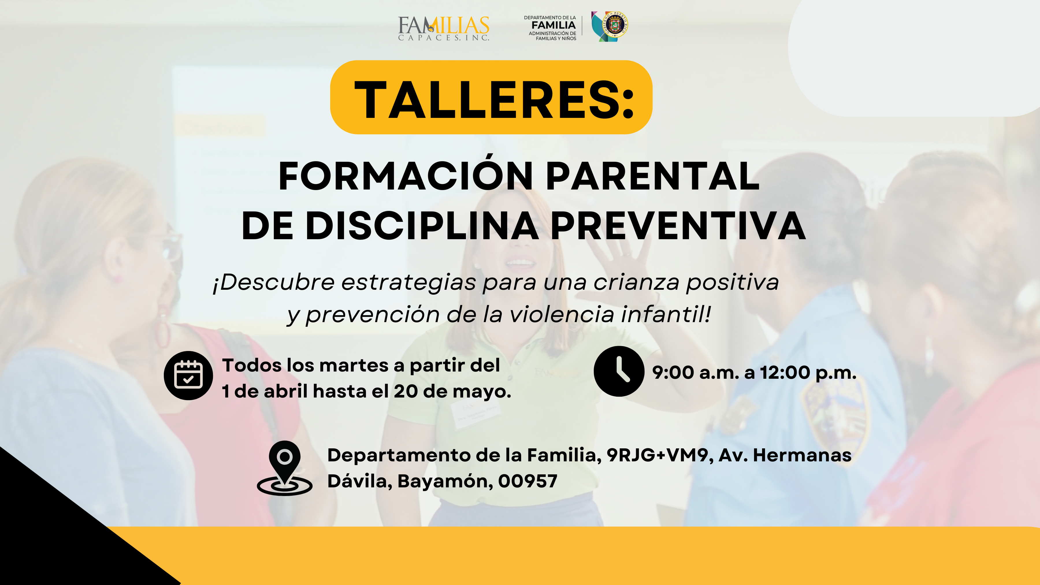 Los talleres se llevarán a cabo todos los martes, desde el 1 de abril hasta el 20 de mayo de 2025, en horario de 9:00 a.m. a 12:00 p.m., en las instalaciones del Departamento de la Familia en Bayamón (9RJG+VM9, Avenida Hermanas Dávila, 00957).