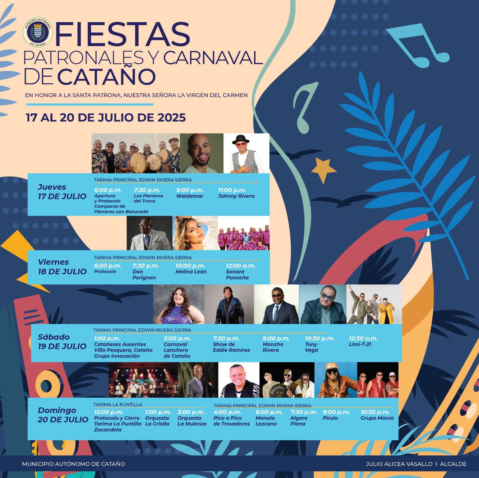 El Municipio de Cataño invita a toda la ciudadanía a participar de las tradicionales Fiestas Patronales y Carnaval 2025 en honor a la Santa Patrona, la Virgen del Carmen, que se celebrarán del 17 al 20 de julio en la tarima principal Edwin Rivera Sierra.