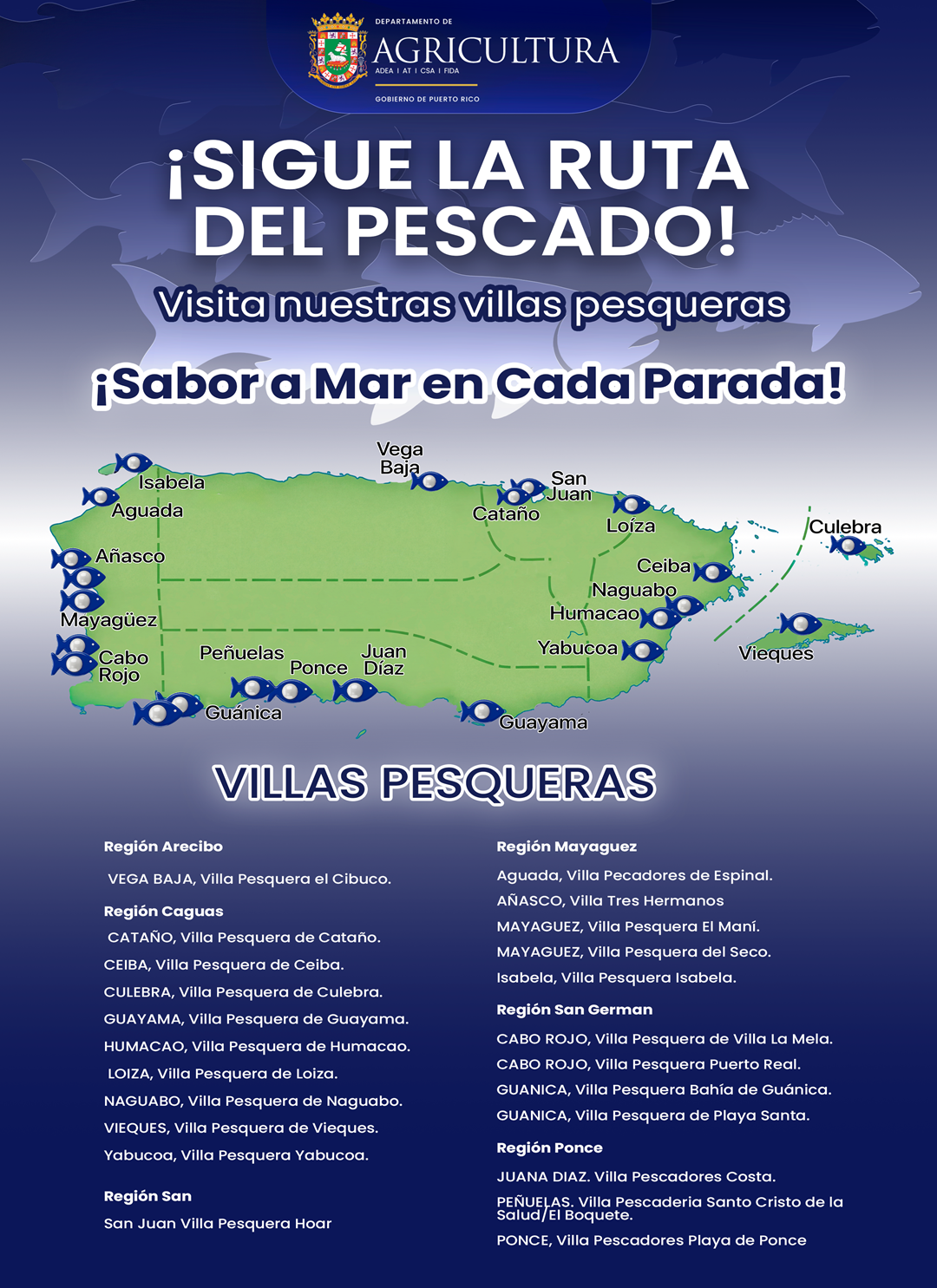 “Con esta iniciativa queremos invitar a nuestra gente a recorrer las villas pesqueras y conocer de primera mano el trabajo extraordinario que realizan nuestros pescadores. La Ruta del Pescado es una oportunidad para disfrutar pescado y marisco 100% fresco y local, al tiempo que respaldamos a las familias que viven de esta importante industria agrícola”, expresó el Agro. Irving Rodríguez Torres.