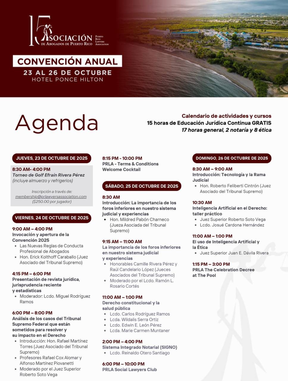 La agenda de este año promete ser una de las más completas y memorables hasta la fecha, ofreciendo 17 horas de educación jurídica continua sin costo para los miembros. Esto incluye los seis créditos de ética profesional, cumpliendo con las nuevas reglas.