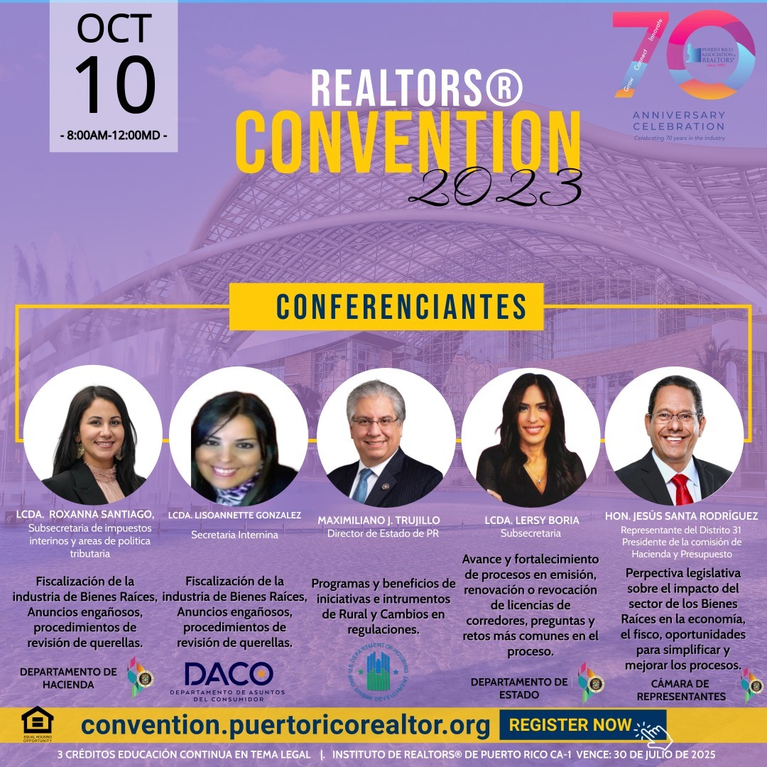 La presidenta de los REALTORS, Melissa Montero, expresó su entusiasmo por la convención: «Este año celebramos el 70 aniversario y estamos comprometidos en proporcionar a nuestros socios las herramientas y el conocimiento necesarios para prosperar en el mercado inmobiliario de Puerto Rico. La convención promete ser una experiencia enriquecedora para todos los profesionales de bienes raíces interesados en el crecimiento personal y profesional, así como en la adquisición de conocimiento valioso sobre tendencias y tecnologías emergentes. Durante los tres días educativos en los que tendremos invitados de diferentes sectores, podrán entender mejor los Asuntos Gubernamentales y su impacto en nuestra industria y programas de gobiernos favorables para el desarrollo de la vivienda en Puerto Rico”.