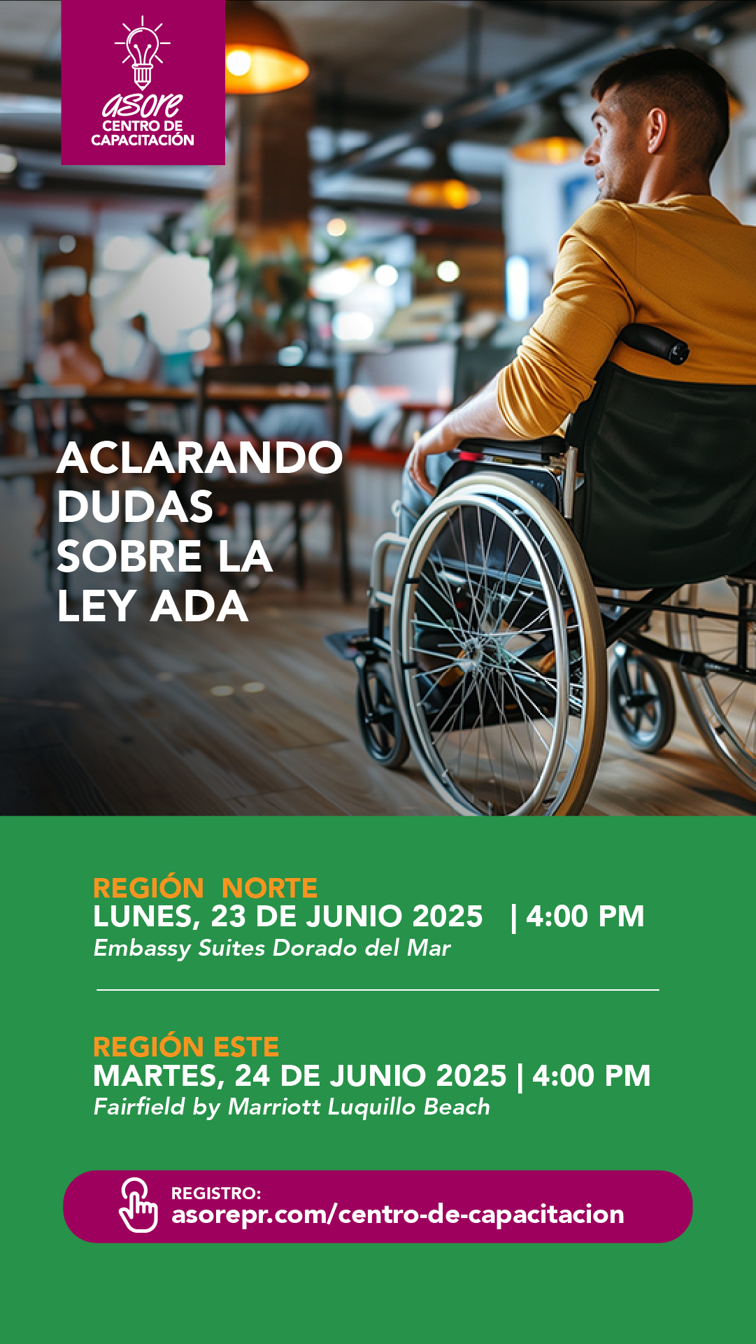 (CyberNews) – La Asociación de Restaurantes de Puerto Rico (ASORE) anunció que celebrará talleres educativos gratuitos sobre la Ley de Estadounidenses con Discapacidades (ADA) dirigidos a dueños y administradores de restaurantes y negocios relacionados, como parte de una iniciativa para promover la inclusión y el cumplimiento legal.