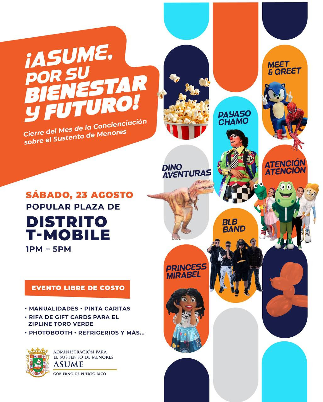 La Administración para el Sustento de Menores (ASUME) celebrará este sábado 23 de agosto una tarde de actividades y entretenimiento en Popular Plaza del Distrito T-Mobile, como parte del cierre del Mes de la Concienciación sobre el Sustento de Menores. El evento, que se desarrollará de 1:00 p.m. a 5:00 p.m. y es gratuito, reunirá a niños, padres y madres en un espacio pensado para promover la unión familiar y la sana convivencia.