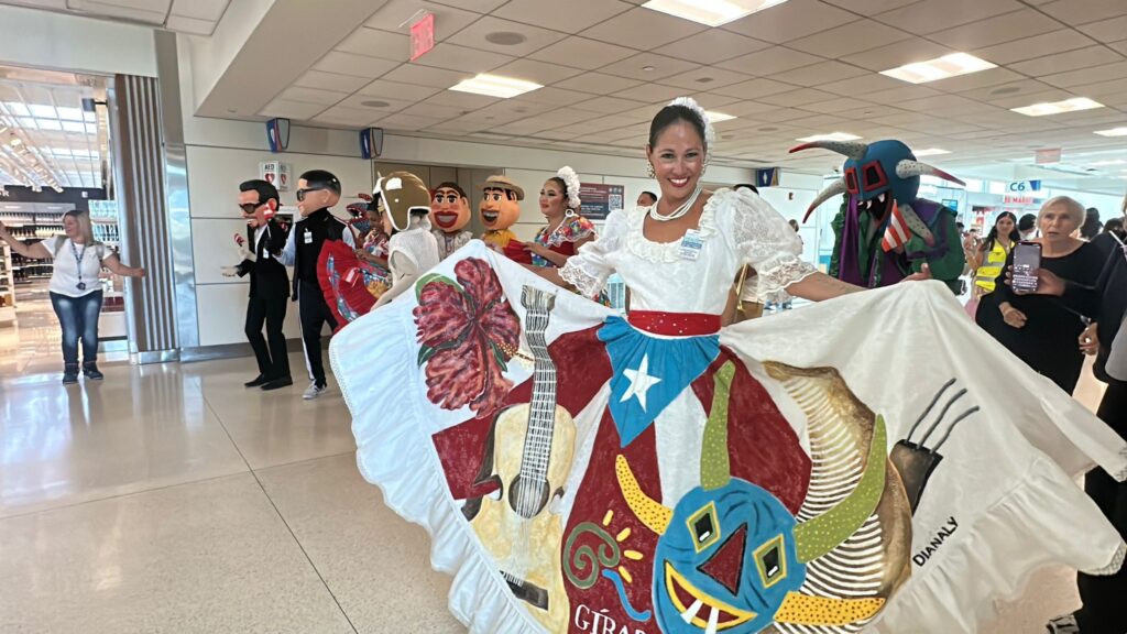 Aeropuerto LMM recibe a pasajeros con plena, cabezudos y arte en honor a residencia de Bad Bunny en Puerto Rico Notiséis 360 11/07/2025