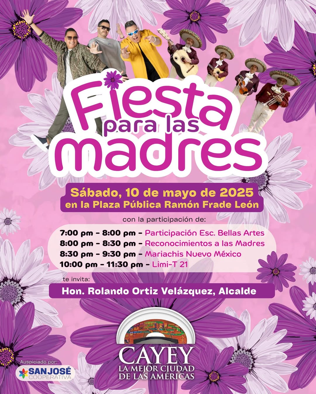 “Gracias a la aportación de San José Cooperativa, desde las 7:00 de la noche estaremos disfrutando del talento de nuestros estudiantes de la Escuela de Bellas Artes, seguido de un reconocimiento especial a nuestras madres cayeyanas”. Ya para las 8:30 de la noche se presentará el Mariachi Nuevo México y a las 10:00 de la noche está pautada la presentación de LímiT-21.