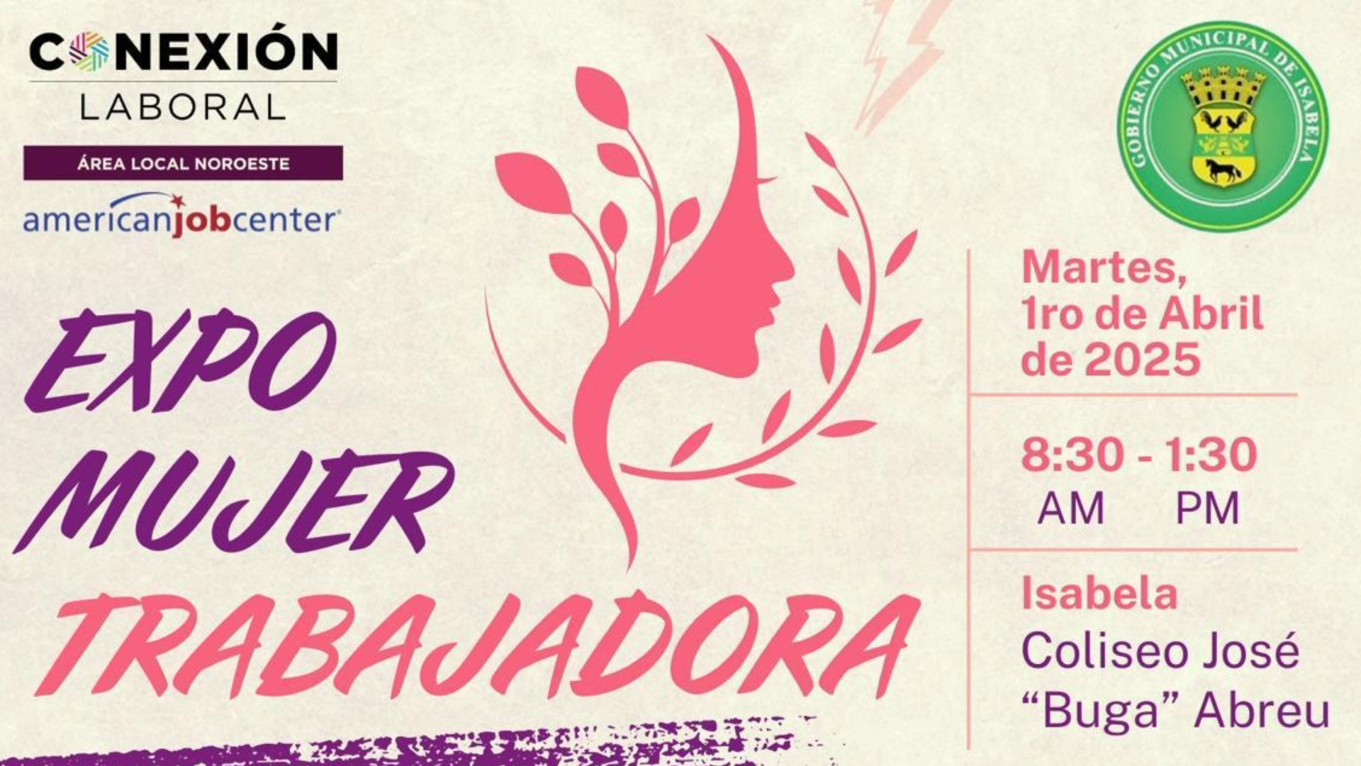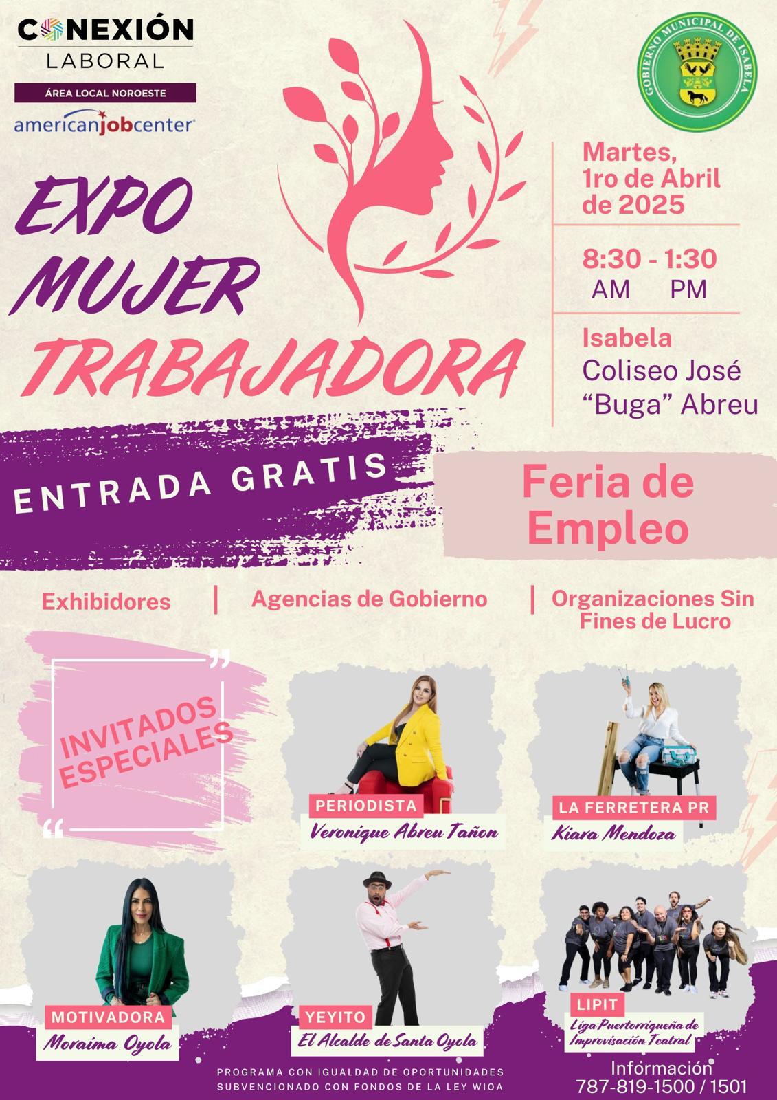 Charlas educativas sobre leyes que protegen a las mujeres en el ámbito laboral, talleres motivacionales, ofertas de empleo para contratación al momento, adiestramientos bajo la elegibilidad de la Ley WIOA así como orientaciones sobre servicios disponibles a través de diferentes agencias gubernamentales, son parte de la oferta de la segunda Expo Mujer Trabajadora. La actividad enmarcada en la mujer se realizará el próximo martes, 1 de abril, en el Coliseo José “Buga” Abreu de Isabela, anunció Lourdes Ríos Muñiz, directora de Conexión Laboral del Noroeste, entidad que lidera la actividad.