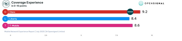 Por su parte, Opensignal, firma líder en análisis de experiencia y cobertura móvil basada en datos reales de usuarios, reconoció por primera vez a Claro con el premio a la Mejor Cobertura Móvil, destronando al competidor. Este estudio, realizado entre el 1 de marzo y el 29 de mayo de 2025, confirmó a Claro como ganador en la métrica Coverage Experience, que mide la cobertura de las redes móviles en los lugares donde las personas viven, trabajan y se desplazan, reflejando con mayor precisión la conectividad real del usuario promedio. A diferencia de las estimaciones tradicionales que miden la cobertura solo por área geográfica o población, esta métrica analiza las zonas pobladas donde se espera señal razonable, asignando una puntuación del 0 al 10. En este indicador, Claro alcanzó un impresionante 9.2, posicionándose como líder absoluto.