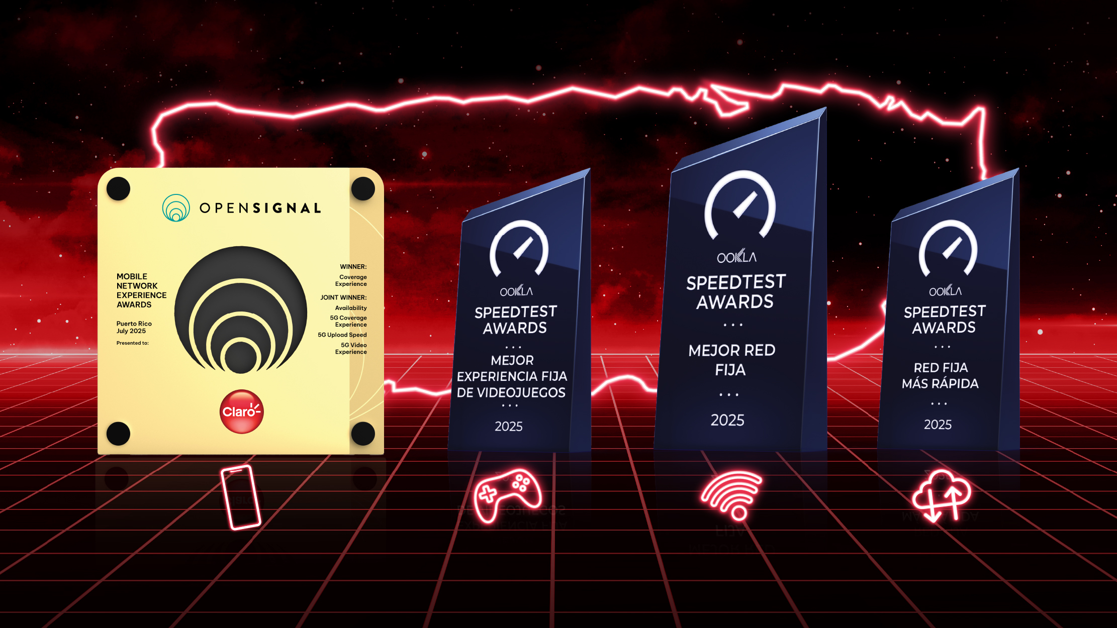 Las principales firmas independientes de análisis de conectividad han reconocido a Claro, consolidándola como la red más poderosa y confiable en Puerto Rico. Durante el primer y segundo trimestre de 2025, Ookla®, empresa global líder en pruebas de rendimiento y métricas de internet, otorgó a Claro los codiciados Speedtest Awards™ en las categorías de Mejor Red Fija, Red Fija Más Rápida y, por segundo año consecutivo, Mejor Experiencia Fija de Videojuegos. Esta repetición de premio reafirma el desempeño sobresaliente de la red de fibra óptica de Claro, gracias a su estabilidad, velocidad y experiencia superior en línea.