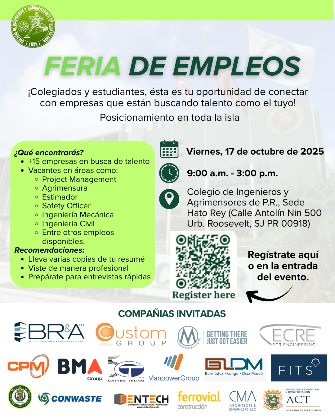 El Colegio de Ingenieros y Agrimensores de Puerto Rico (CIAPR) anunció la celebración de su Feria de Empleo 2025, un evento diseñado para conectar directamente a colegiados, estudiantes y egresados con empresas que actualmente buscan talento en la isla.