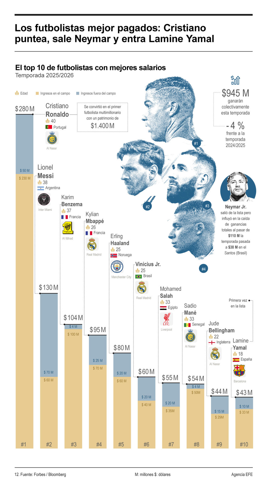 En conjunto, Forbes estima que los diez jugadores de fútbol mejor pagados del mundo ganarán unos 808 millones de euros durante la campaña 2025-2026; sin embargo, el top ha bajado colectivamente casi un 4 % desde la 2024-2025, en gran parte porque el brasileño Neymar Jr, el número 3 en la lista del año pasado (94 millones), ha caído completamente del ránking tras su vuelta al Santos.