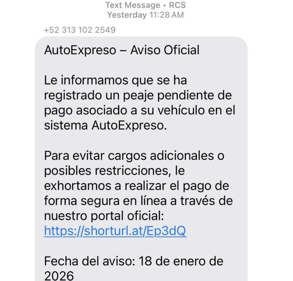 “Nuestro equipo de la Unidad para la Detección de Esquemas Fraudulentos contra el Consumidor identificó una nueva modalidad de fraude. El fraude consiste en el envió de un mensaje de texto indicando que se registró un ‘peaje pendiente de pago asociado a su vehículo en el sistema AutoExpreso’, esto es un intento de llamar la atención del consumidor para que luego pulse un enlace (https://sshorturl.at/Ep3dQ) que es utilizado por estos elementos criminales para hurtar la data del dispositivo que se utiliza para acceder a ese ‘link’. Es un fraude bien sofisticado”, comentó Torres Montalvo.