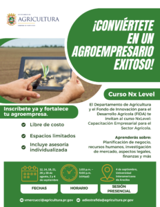 Con el objetivo de fortalecer el desarrollo de agroempresas en Puerto Rico, el Departamento de Agricultura, a través del Fondo de Innovación para el Desarrollo Agrícola (FIDA), anunció hoy la apertura del curso Nx Level: Programa de Capacitación Empresarial para Agricultores y Jóvenes Agroempresarios, a celebrarse durante los meses de agosto y septiembre de 2025.