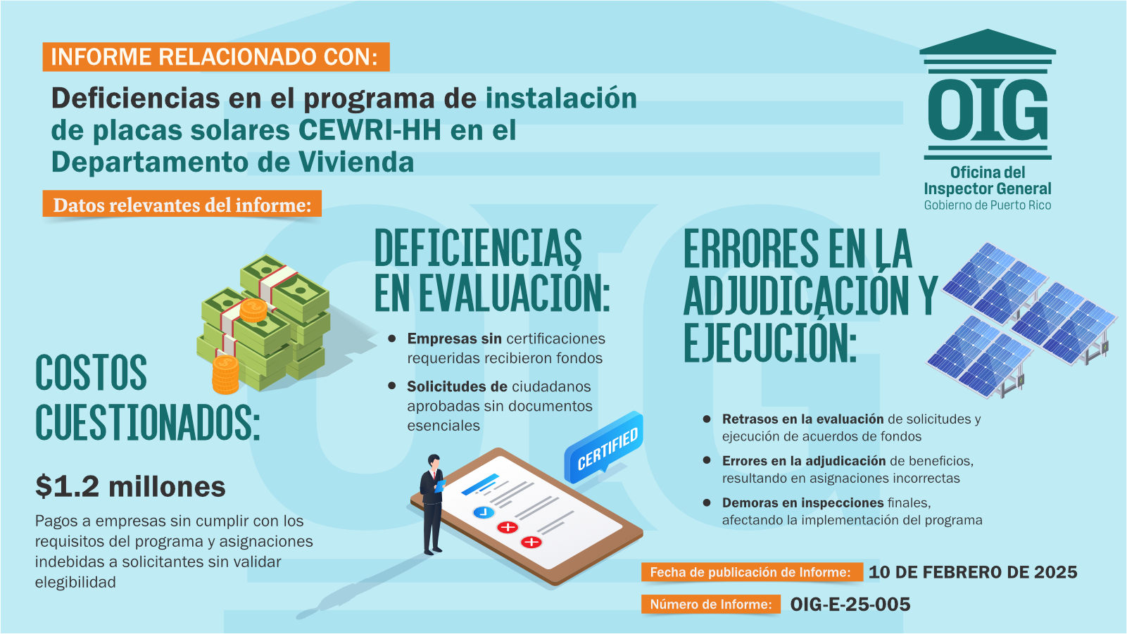 Un informe de la Oficina del Inspector General de Puerto Rico (OIG), reveló ciertas deficiencias relacionadas a los pagos a empresas contratadas para la instalación de sistemas de placas solares del Programa de Instalaciones Comunitarias para la Resiliencia Energética y Abastecimiento de Agua (CEWRI-HH), administrado por el Departamento de la Vivienda (DV).