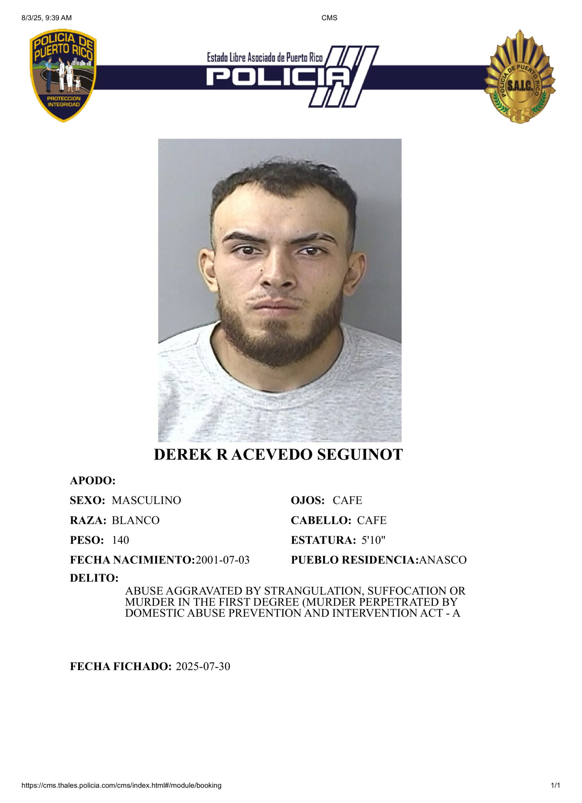La Fiscalía de Aguadilla y Personal de la División de Violencia Doméstica adscrito a la Policía de Puerto Rico, radicó 24 cargos criminales contra Derek Rafael Acevedo Seguinot de 24 años, residente de Añasco, por (2) artículos 93 Tentativa de Asesinato, (7) artículos 3.1 Maltrato, (1) 3.2 Maltrato Agravado, (5 ) 3.3 Maltrato mediante Amenaza, (1) 3.4 Maltrato mediante Restricción Libertad de la Ley Violencia Género y (3) 6.05 Portación, Transportación o uso de armas de fuego sin licencia, (1) 6.06 Portación y uso de armas blancas, (2) 6.14 Disparar o Apuntar un arma de fuego,(1)6.22 Fabricación, Distribución, Posesión y Uso de Municiones, Importación de municiones y (1) Ley 154 de Maltrato Animal.