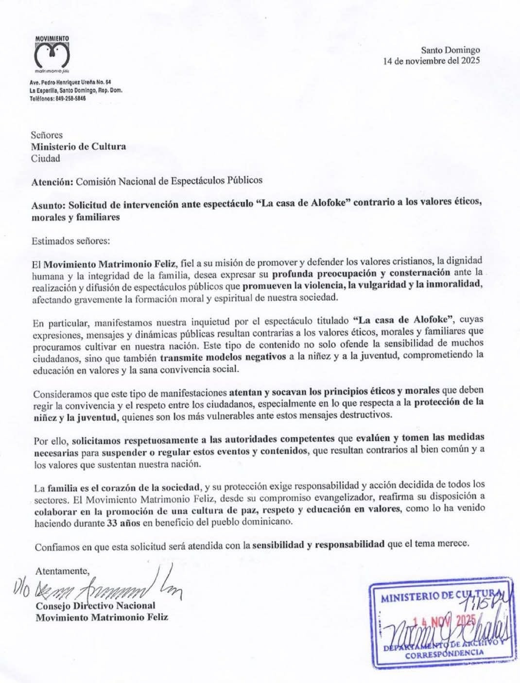 El Movimiento Matrimonio Feliz envió una misiva a la Comisión Nacional de Espectáculos Públicos del Ministerio de Cultura de la República Dominicana el 14 de noviembre de 2025 solicitando la intervención o suspensión del contenido de “La Casa de Alofoke 2”, al expresar preocupación por mensajes que consideran “contrarios a los valores morales y familiares”.