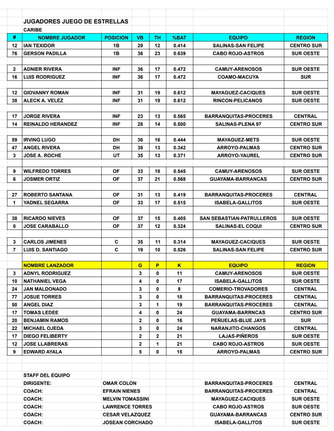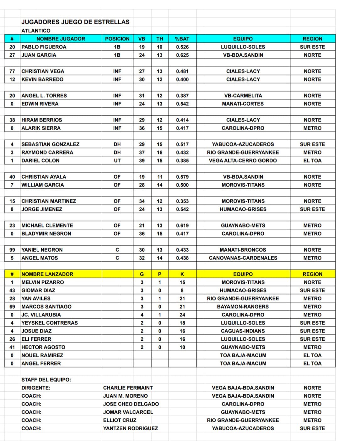 El equipo de la División Atlántico incluye a las regiones Norte, El Toa, Metro y Sureste, y estará a cargo de Charlie Fermaint, dirigente del equipo Bda. Sandín, de Vega Baja. Por su parte, el equipo de la División Caribe está representado por las regiones Sur, Suroeste, Central y Centro Sur, y será dirigido por Omar Colón Rivera, de los Próceres de Barranquitas.