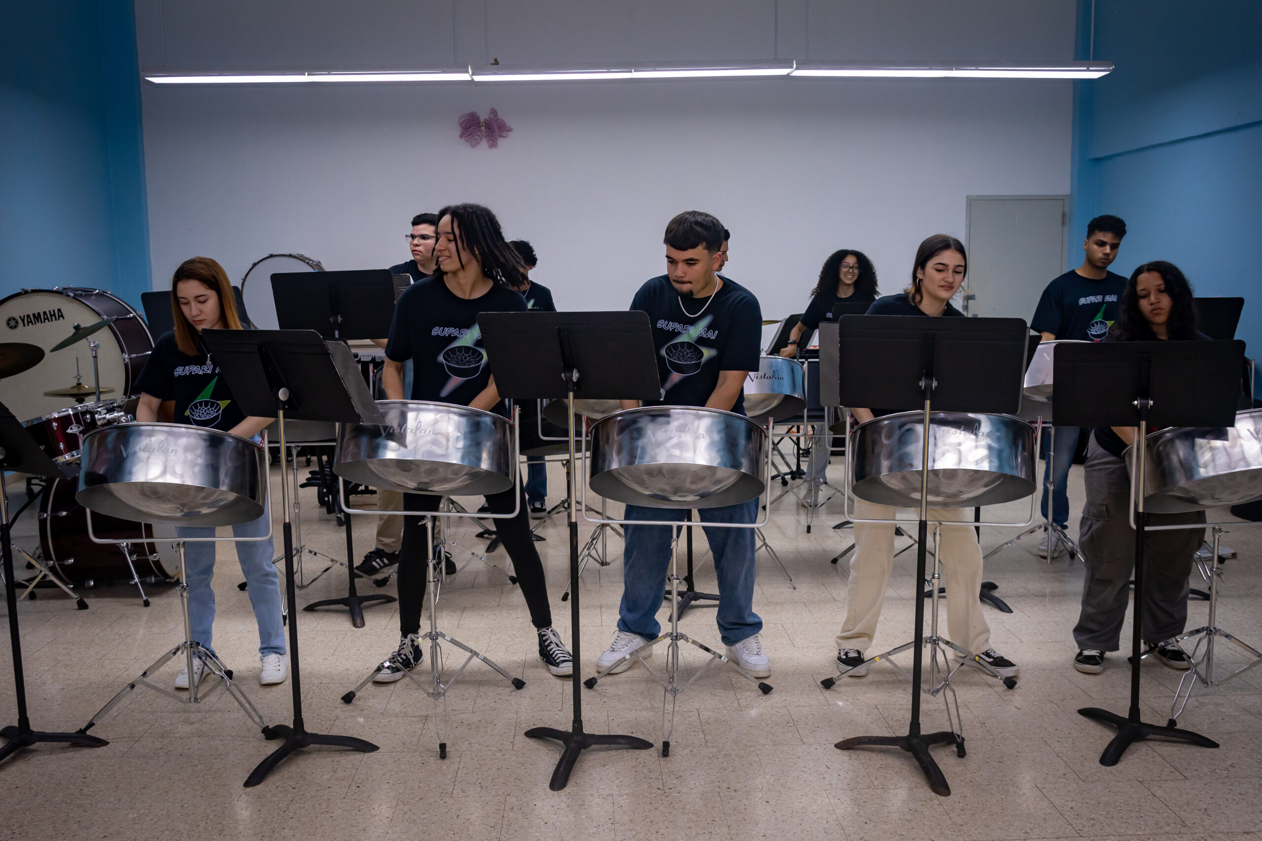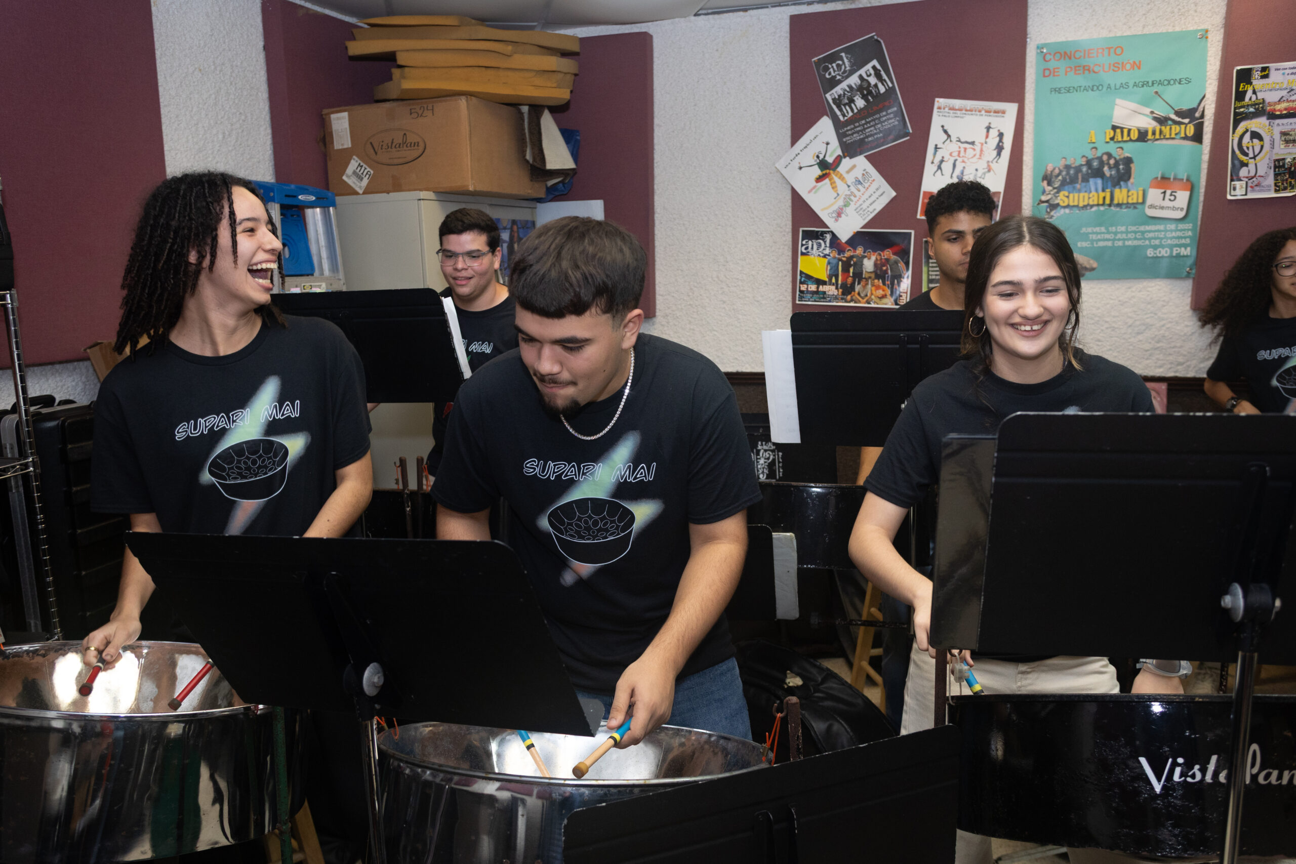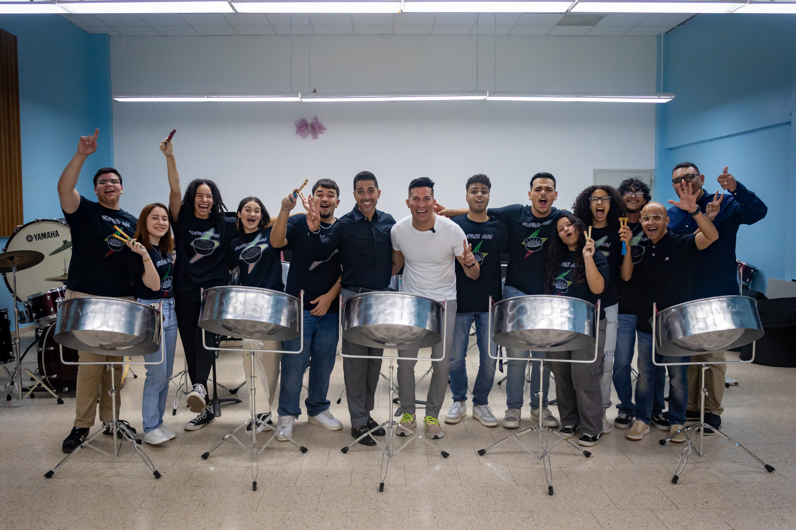 Integrantes de Supari Mai Steel Band de la Escuela Libre de Música Antonio Paoli de Caguas, recibieron con gran sorpresa y alegría, un equipo de instrumentos nuevos donados por la empresa de energía solar Home Power Sun Energy.