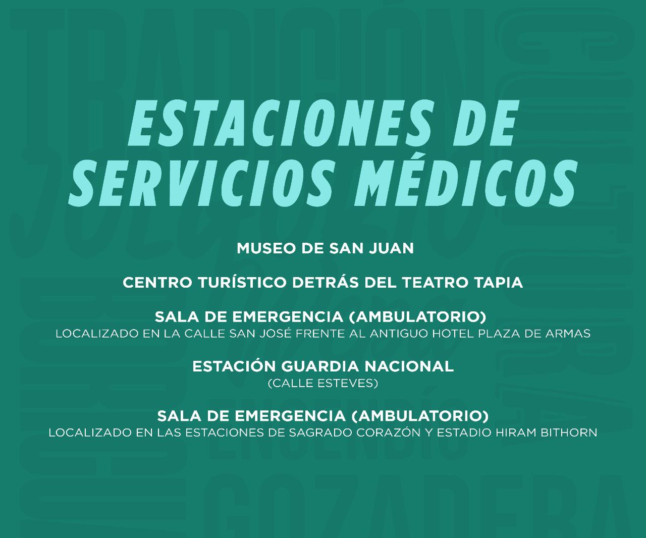OMME dispondrá de 10 ambulancias distribuidas en puntos estratégicos, así como unidades de respuesta rápida y de rescate marítimo. Además, se habilitarán estaciones de emergencia en el Museo de San Juan, el Centro de Información Turística (detrás del Teatro Tapia), la Calle San José esquina Calle Fortaleza y las instalaciones de la Guardia Nacional en Puerta de Tierra, donde personal médico ofrecerá servicios de primeros auxilios y monitoreo cardiaco.