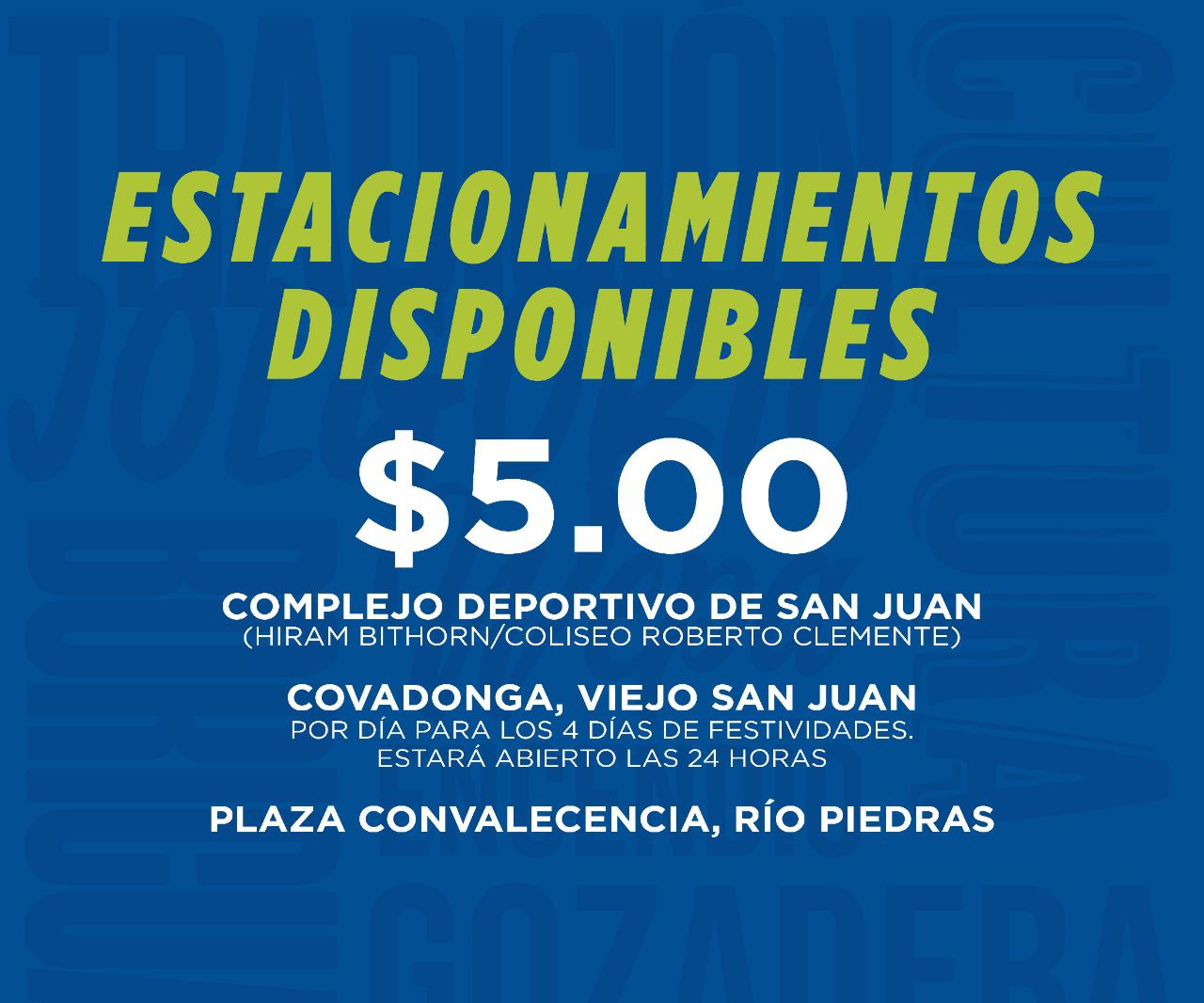Los estacionamientos públicos habilitados incluyen el Estadio Hiram Bithorn, Plaza de la Convalecencia y Covadonga, con un costo de $5 por vehículo. El estacionamiento de La Puntilla estará reservado exclusivamente para residentes del Viejo San Juan.