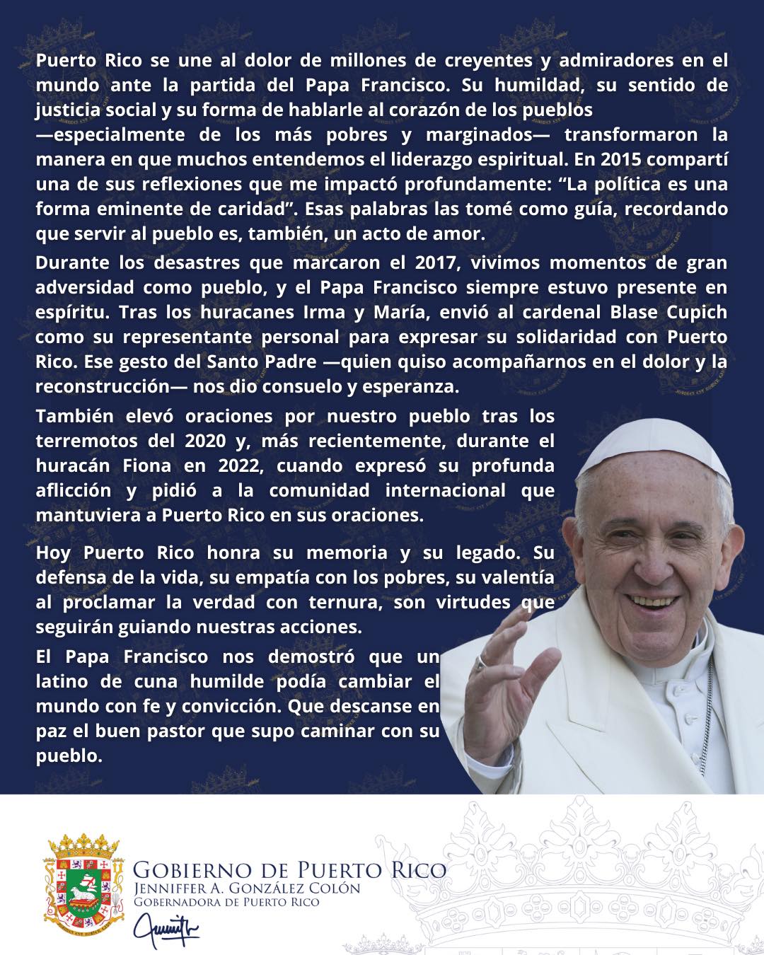 “Puerto Rico se une al dolor de millones de creyentes y admiradores en el mundo ante la partida del Papa Francisco. Su humildad, su sentido de justicia social y su forma de hablarle al corazón de los pueblos —especialmente de los más pobres y marginados— transformaron la manera en que muchos entendemos el liderazgo espiritual. En 2015 compartí una de sus reflexiones que me impactó profundamente: “La política es una forma eminente de caridad”. Esas palabras las tomé como guía, recordando que servir al pueblo es, también, un acto de amor.