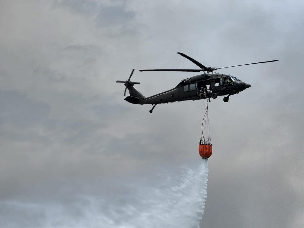 Un helicóptero UH-60 Black Hawk, perteneciente a la instalación de aviación del Ejército de la Guardia Nacional, ha sido equipado con un sistema de supresión de incendios «Bambi Bucket» para realizar descargas de agua precisas sobre las áreas más afectadas. Esta capacidad aérea es fundamental para alcanzar terrenos de difícil acceso y controlar la propagación del fuego de manera más efectiva.