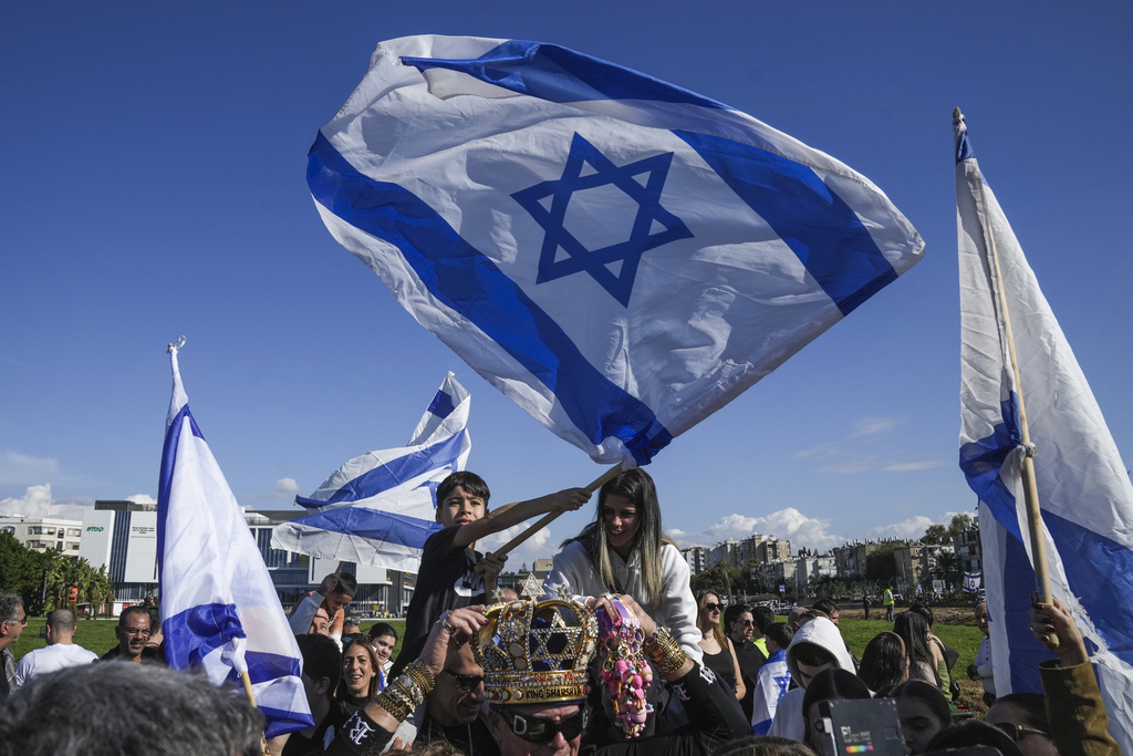 Varias personas se congregan mientras esperan por la llegada de cuatro soldados israelíes que fueron liberadas por Hamás, junto al helipuerto del Hospital Beilinson en Petaj Tikva, cerca de Tel Aviv, Israel, el sábado 25 de enero de 2025. (AP Foto/Maya Alleruzzo)
