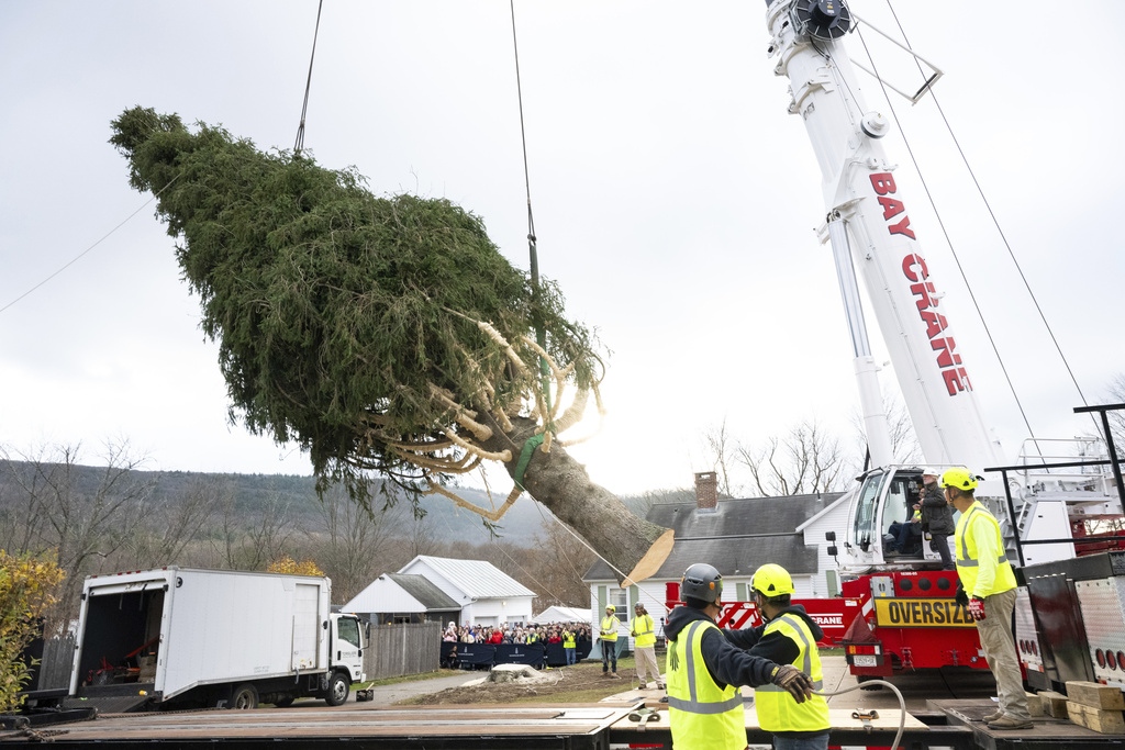 El imponente conífero, donado por la familia Albert de West Stockbridge, Massachusetts, fue talado el jueves por la mañana y viajó 225 kilómetros (140 millas) sobre la plataforma de un camión. Es el primer árbol de Navidad del Rockefeller Center que proviene de Massachusetts desde 1959.