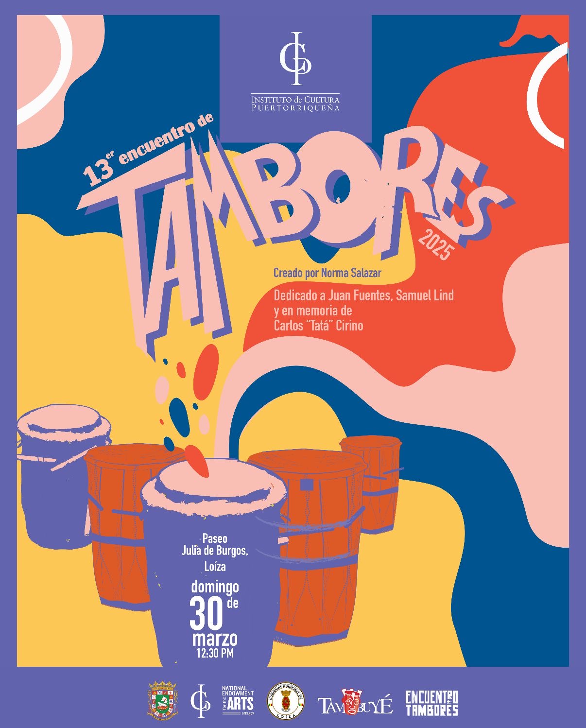 El Instituto de Cultura Puertorriqueña (ICP) anunció que al 13er Encuentro de Tambores se celebrará el domingo, 30 de marzo, a las 12:30 pm en el Paseo Julia de Burgos de Loíza. Este año, se esperan nueve delegaciones compuestas por 40 barrileros y barrileras, quienes estarán acompañados de 800 intérpretes de Bomba. En esta ocasión, las delegaciones que dirán presente son de Cangrejos, Carolina, Loíza, Norte, Sur, Este, Oeste y la diáspora. A estas se une la delegación de la Montaña, quienes se presentan por primera vez con una concurrida participación de diferentes pueblos del centro de la Isla. Además, se espera la participación de cantadores y cantadoras, bailadores y bailadoras de este tradicional ritmo.