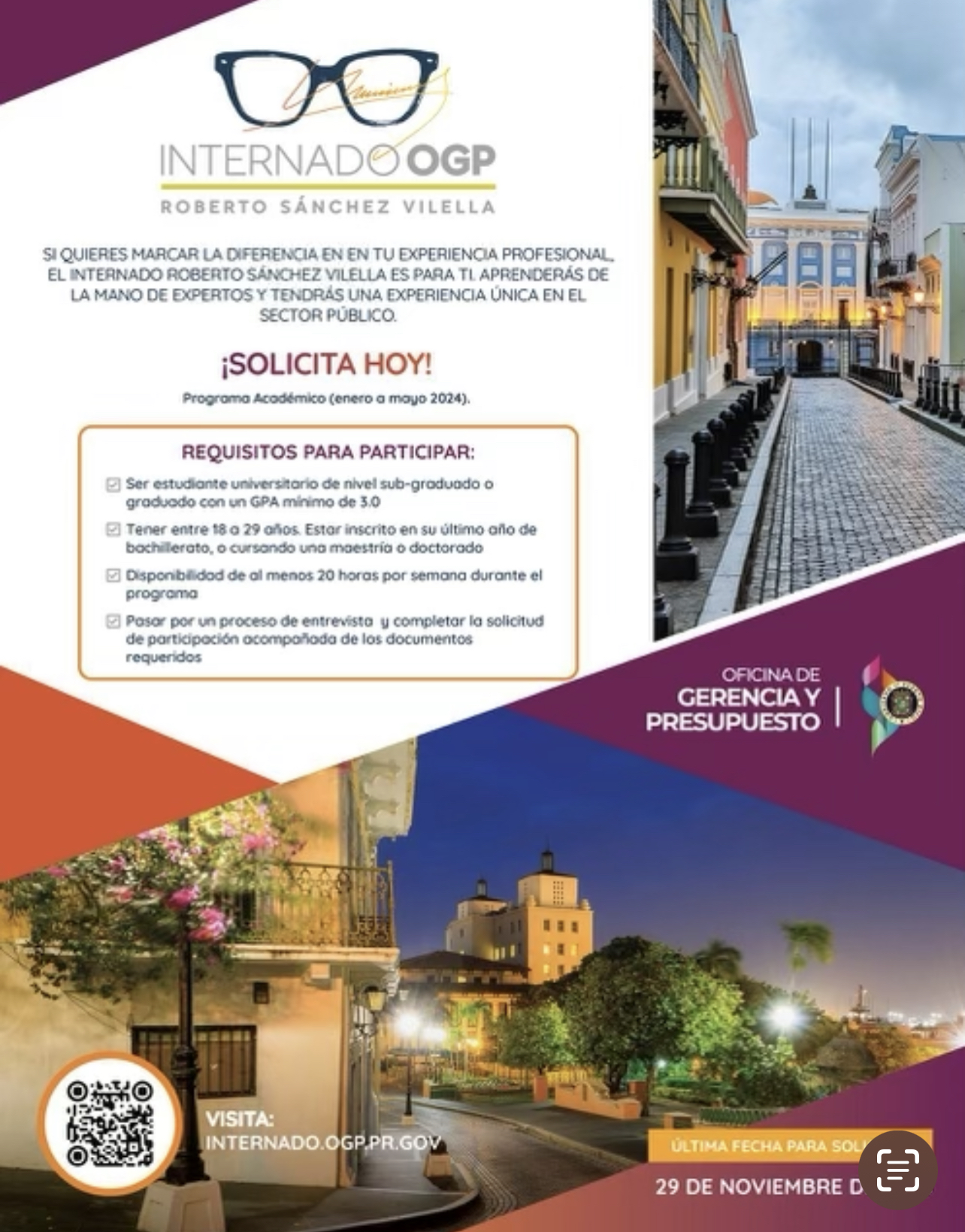 La convocatoria estará abierta desde hoy, 1 de noviembre de 2023. Los interesados deben tener entre 18 a 29 años de edad y ser estudiante a nivel sub-graduado o graduado en una institución universitaria ubicada en Puerto Rico. En el caso de ser un estudiante sub-graduado, debe haber completado, al menos, la mitad o más de los requisitos necesarios para obtener un grado o título de bachillerato. Asimismo, debe estar matriculado en su último año de bachillerato o cursando una maestría o doctorado. Para completar la solicitud, se debe acceder a la página web: internado.ogp.pr.gov. Se aceptarán solicitudes hasta el 29 de noviembre de 2023.
