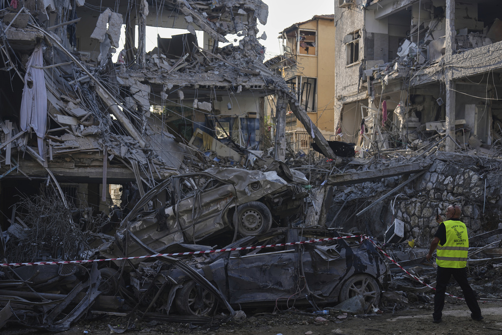 Efectivos de las fuerzas de seguridad israelíes inspeccionan un viviendas destruidas por un misil iraní, en Rishon Lezion, Israel, el 14 de junio de 2025. (AP Foto/Ohad Zwigenberg)