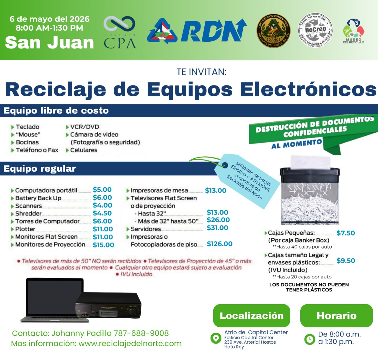 Con el propósito facilitar a ciudadanos y empresas la disposición adecuada de equipos electrónicos en desuso, así como ofrecer un mecanismo seguro para la destrucción de documentos confidenciales, el Colegio de Contadores Públicos Autorizados (CCPA) anunció el “Día de Reciclaje de Equipo Electrónico y Destrucción de Documentos Confidenciales”, que se llevará a cabo el miércoles, 6 de mayo de 2026, en el Atrio del Capital Center en Hato Rey.