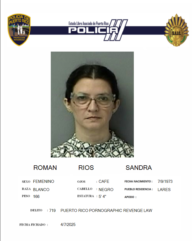 La designada secretaria del Departamento de Justicia, Janet Parra Mercado, informó que la Fiscalía de Arecibo, presentó cargos contra Sandra Román Ríos, de 51 años, por grabar sin autorización y difundir contenido explícito de Alex Ramos Díaz, de 51 años, y Rosa Vargas Rodríguez, de 58 años, a un tercero en el municipio de Arecibo.
