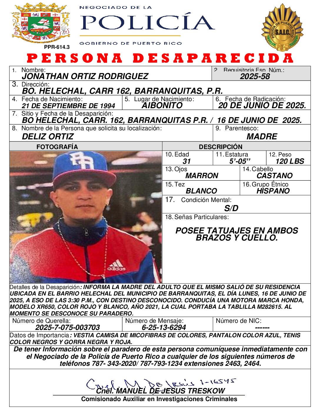 La División de Personas Desaparecidas del Cuerpo de Investigaciones Criminales del Área de Aibonito adscritos al Negociado de la Policía de Puerto Rico solicitan la ayuda ciudadana para dar con el paradero de Jonathan Ortiz Rodríguez de 31 años, reportado desaparecido por su madre, Deliz Ortiz el 16 de junio de 2025 en el pueblo de Barranquitas.