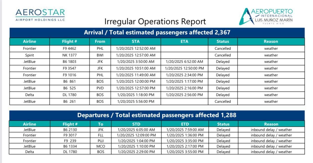(CyberNews) Alrededor de 2,367 pasajeros se vieron afectados por retrasos y cancelaciones en vuelos de llegada al Aeropuerto Internacional Luis Muñoz Marín debido a condiciones climáticas adversas informó en la tarde del lunes la empresa Aerostar.