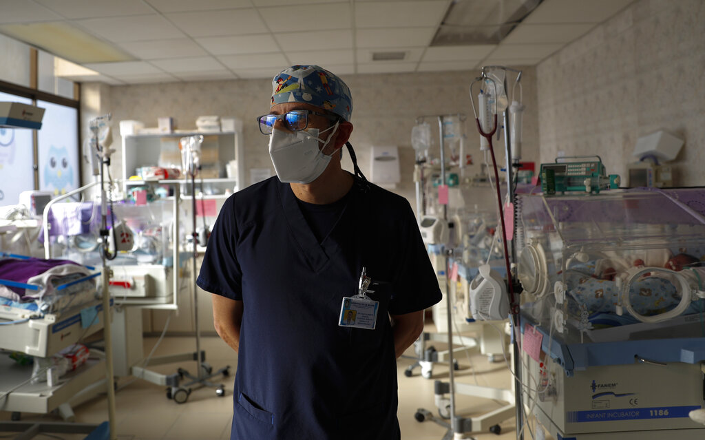 El pediatra Hugo Tejerina se encuentra en la unidad de cuidados intensivos de la sala de maternidad del Hospital de Mujeres en La Paz, Bolivia, el jueves 13 de agosto de 2020. Tejerina dijo que las reservas de oxígeno para los bebés casi se agotaron el fin de semana pasado debido a bloqueos a nivel nacional por parte de partidarios del partido del expresidente Evo Morales que objeta el reciente aplazamiento de las elecciones. (AP Foto/Juan Karita)