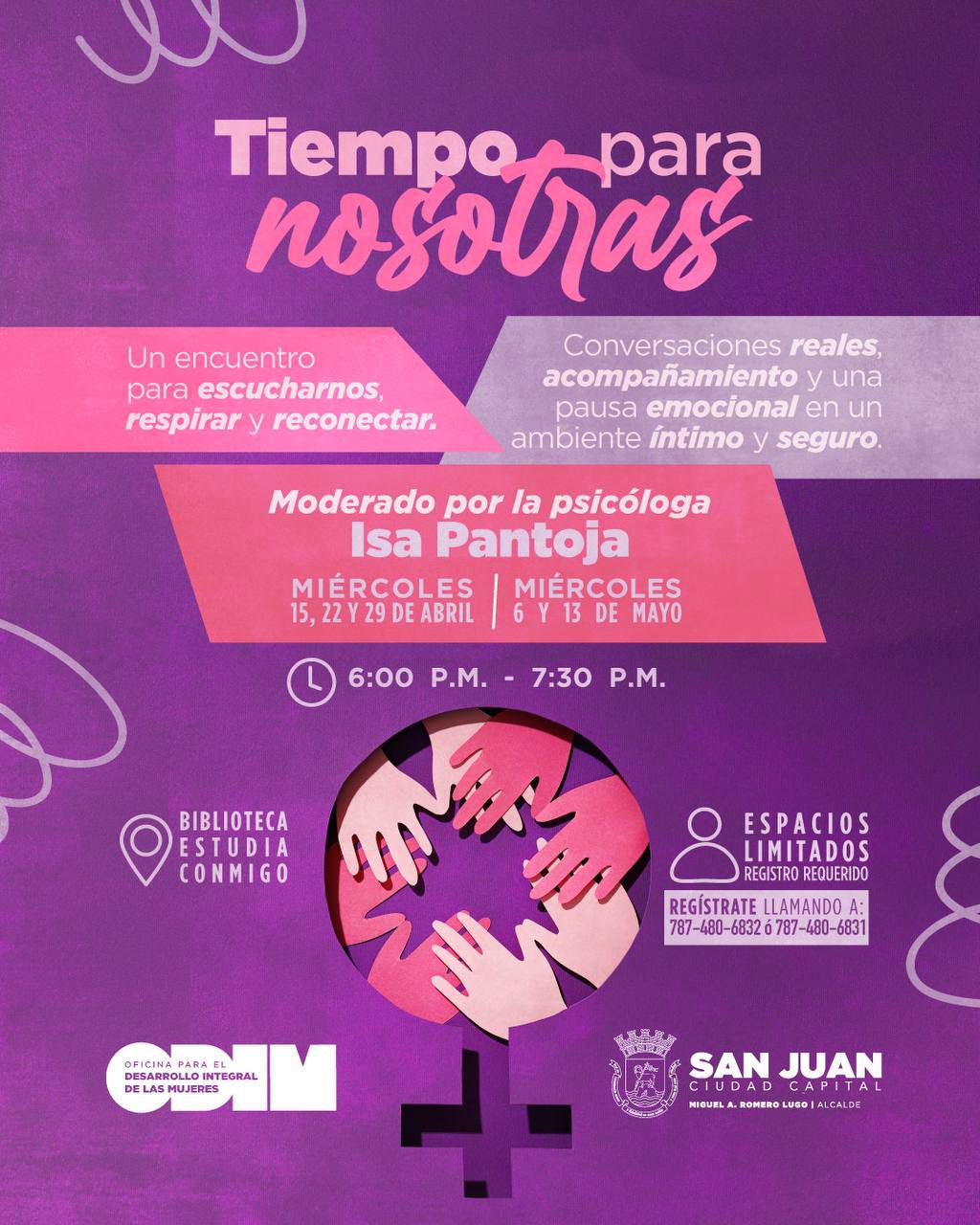 El alcalde de la ciudad capital, Miguel A. Romero Lugo, anunció el inicio del círculo de mujeres “Tiempo para Nosotras”, una iniciativa liderada por la Oficina para el Desarrollo Integral de las Mujeres (ODIM). El programa está dirigido a crear un ambiente seguro donde las mujeres puedan reconectar consigo mismas, compartir experiencias y fortalecer su bienestar emocional. Los encuentros se llevarán a cabo durante varias semanas en la Biblioteca Estudia Conmigo, ubicada frente al estadio Hiram Bithorn, en un entorno íntimo y de confianza.