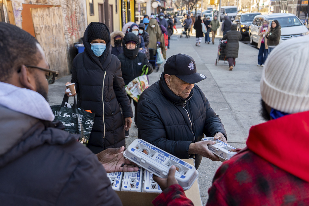 Las personas esperaron pacientemente afuera de un restaurante en Harlem, en un clima frío y ventoso, a que les entregaran un cartón con 12 huevos. Menos de 10 minutos después, los 100 cartones se habían agotado, dejando a muchos con las manos vacías.