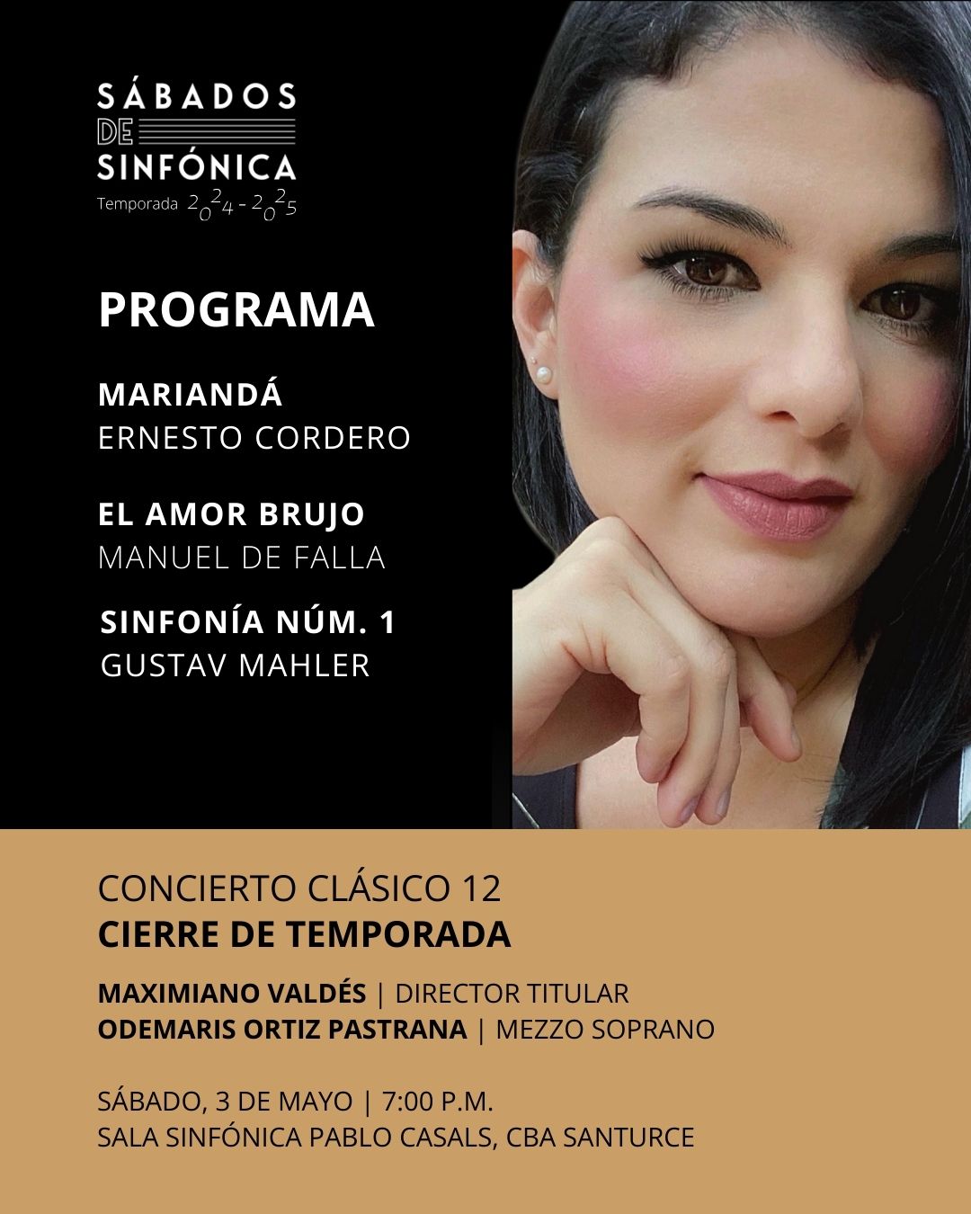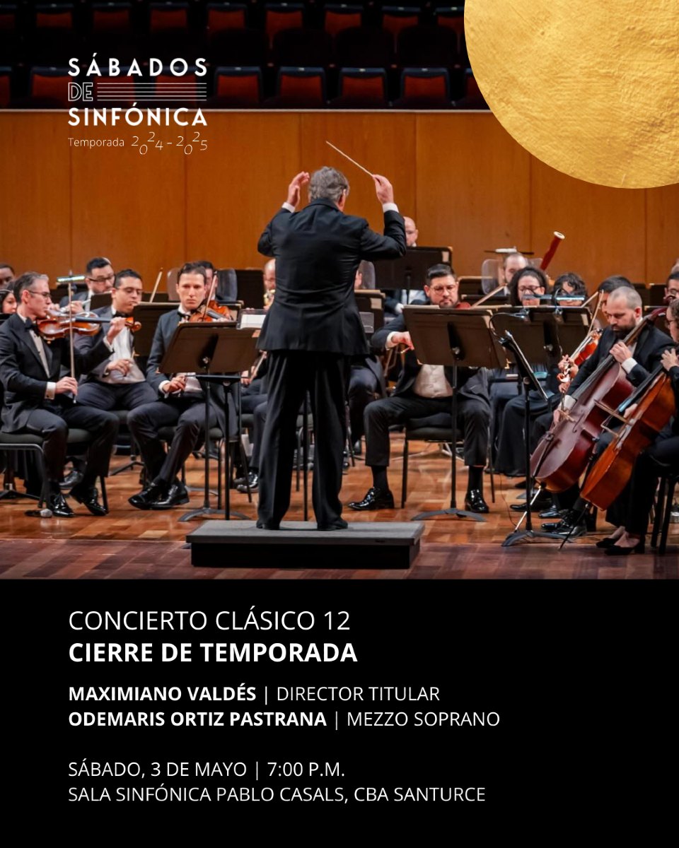 La Orquesta Sinfónica de Puerto Rico (OSPR) anunció la presentación del Concierto Clásico 12, el evento que marcará el cierre de su temporada de conciertos clásicos. Este concierto se llevará a cabo el hoy sábado, 3 de mayo, a las 7:00 pm, en la prestigiosa Sala Sinfónica Pablo Casals del Centro de Bellas Artes de Santurce (CBA), bajo la magistral dirección del maestro Maximiano Valdés, director titular de la OSPR. La mezzosoprano puertorriqueña Odemaris Ortiz Pastrana será la solista invitada.