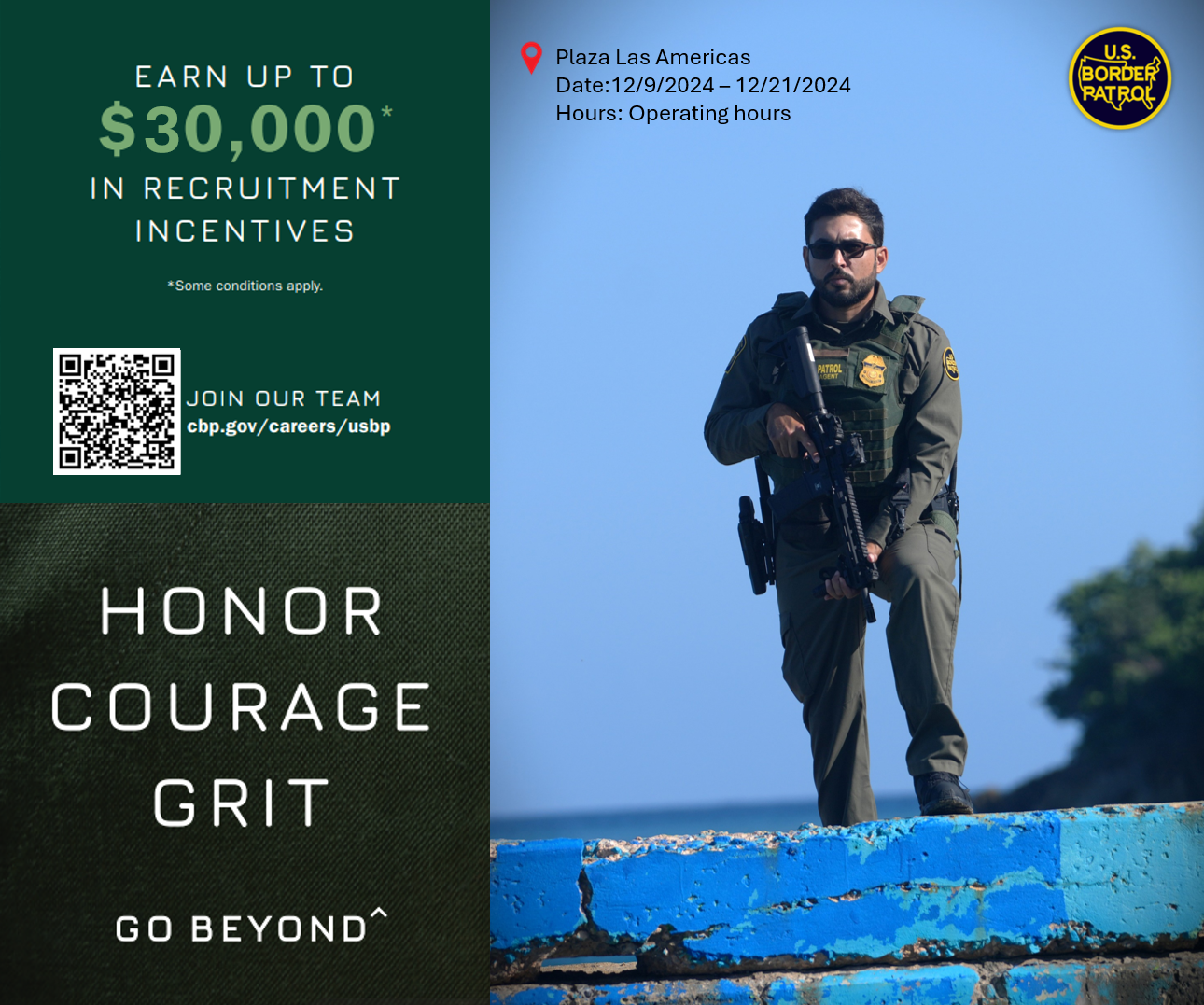 Para solicitar y contestar inquietudes de los interesados, agentes del Sector Ramey de la Patrulla Fronteriza tendrá una mesa de orientación en Plazas Las Américas, (frente a Clarks Shoes) desde el lunes 9 de diciembre hasta el sábado 21 de diciembre de 2024.