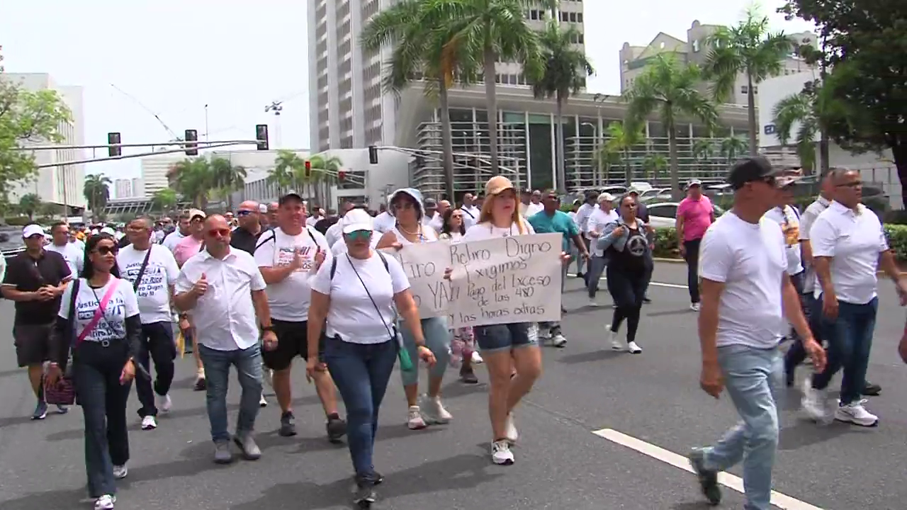 Policías se manifestaron frente al Departamento de Seguridad Pública y luego marcharon hasta las oficinas de la Junta de Control Fiscal, exigiendo el pago de horas extras adeudadas que, según los presidentes de la Asociación de Policías Organizados y la Asociación de Policías Unidos Luchando, llevan más de dos meses de retraso. Además, reclaman mejores condiciones laborales, aumento salarial y el reclutamiento urgente de más personal. Con los detalles, Karla Ramos.