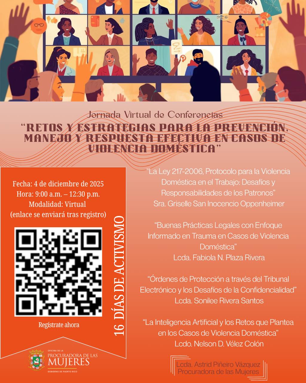 Como parte de las iniciativas de la OPM durante este período, se llevará a cabo la Jornada Virtual de Conferencias titulada “Retos y Estrategias para la Prevención, Manejo y Respuesta Efectiva en Casos de Violencia Doméstica”, el 4 de diciembre de 2025, de 9:00 a.m. a 12:30 p.m.
