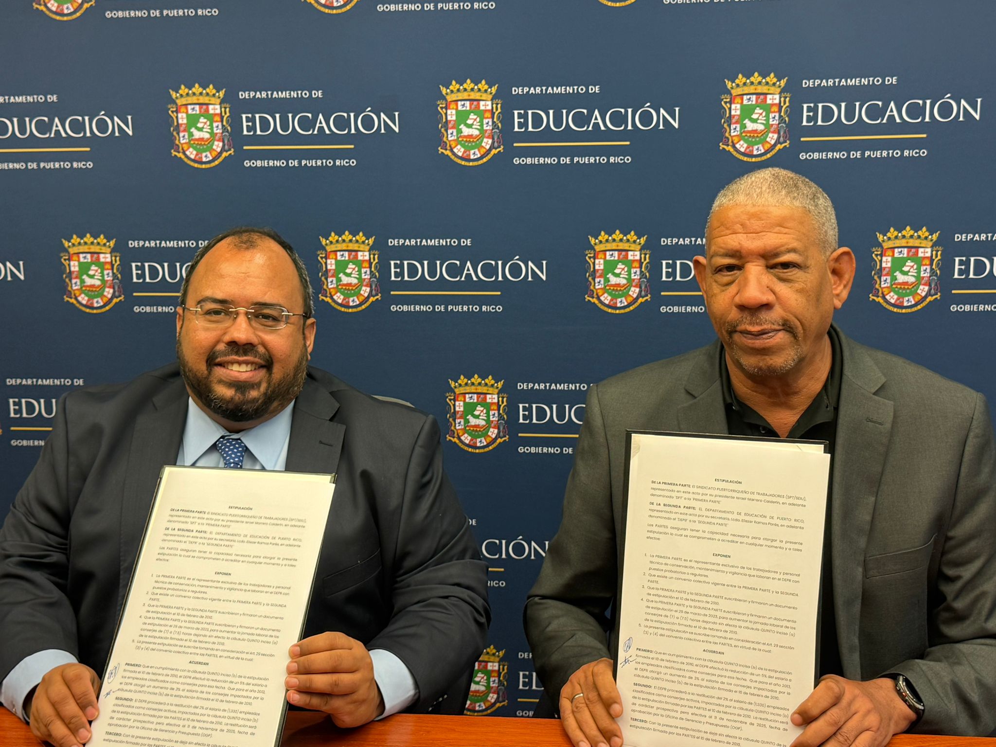 En el día de ayer, lunes 17 de noviembre de 2025, el secretario del Departamento de Educación (DE), Eliezer Ramos Pares y el presidente del Sindicato Puertorriqueño de Trabajadores y Trabajadoras (SPT-SEIU), Israel Marrero Calderin firmaron una estipulación que restituye el 2% del salario al personal de conserjería y mantenimiento del Departamento de Educación. Esta restitución responde a un reclamo histórico que el Sindicato ha sostenido por más de 15 años.
